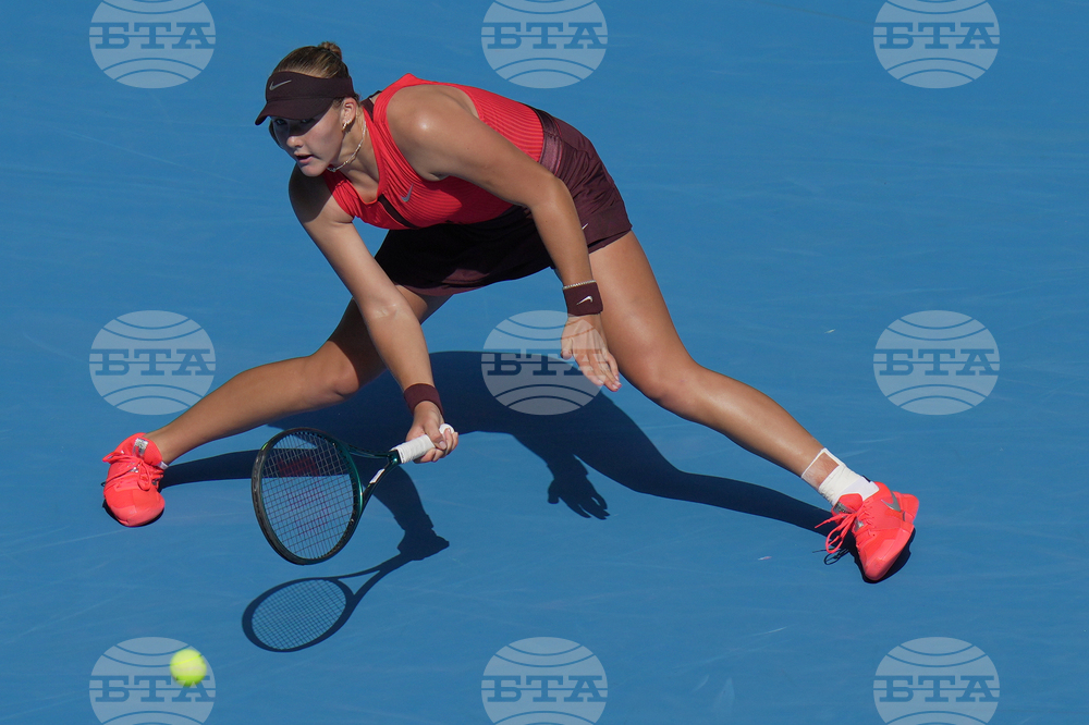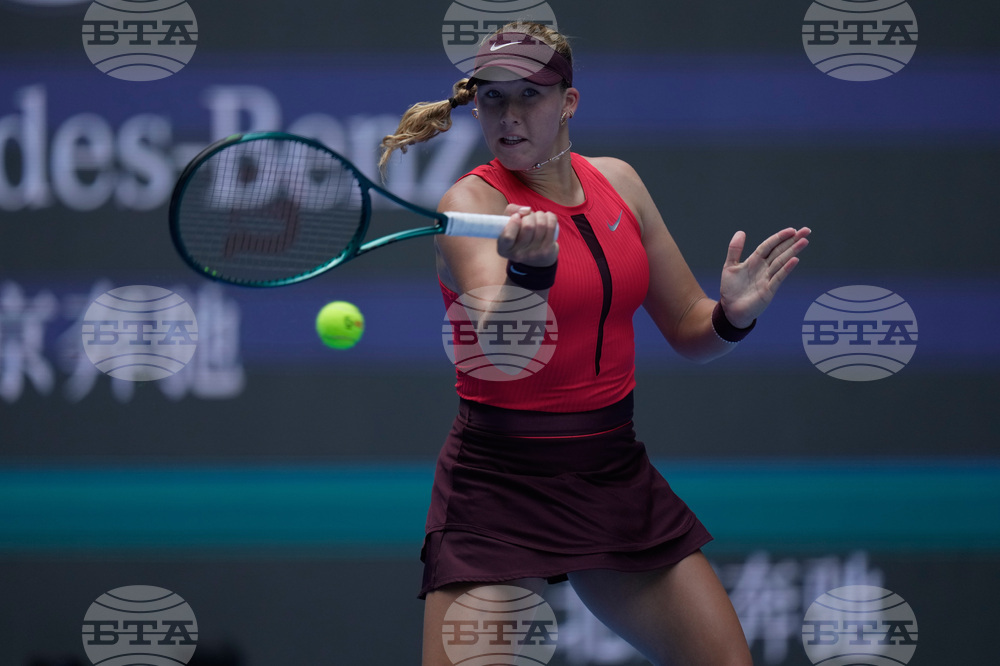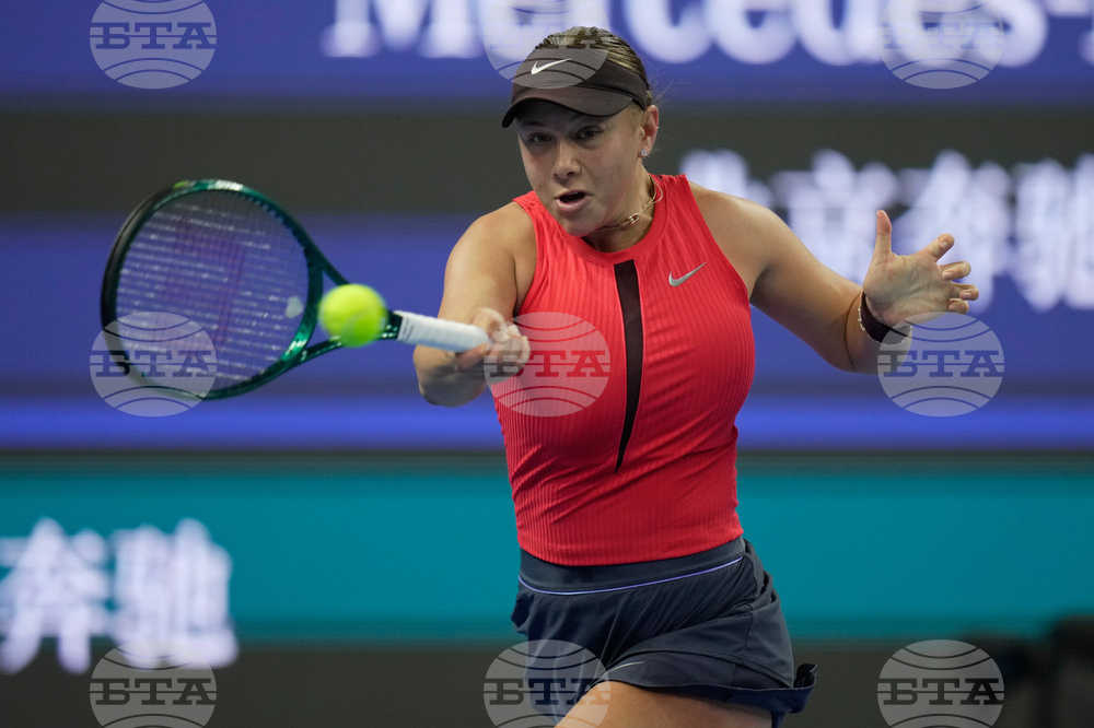 Amanda Anisimova of the United States plays a forehand return to Shuai Zhang of China during a women's singles match of the China Open tennis tournament, at the National Tennis Center, in Beijing, China, Sunday, Sept. 28, 2025. (AP Photo/Mahesh Kumar A.)