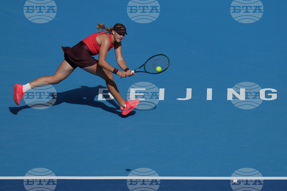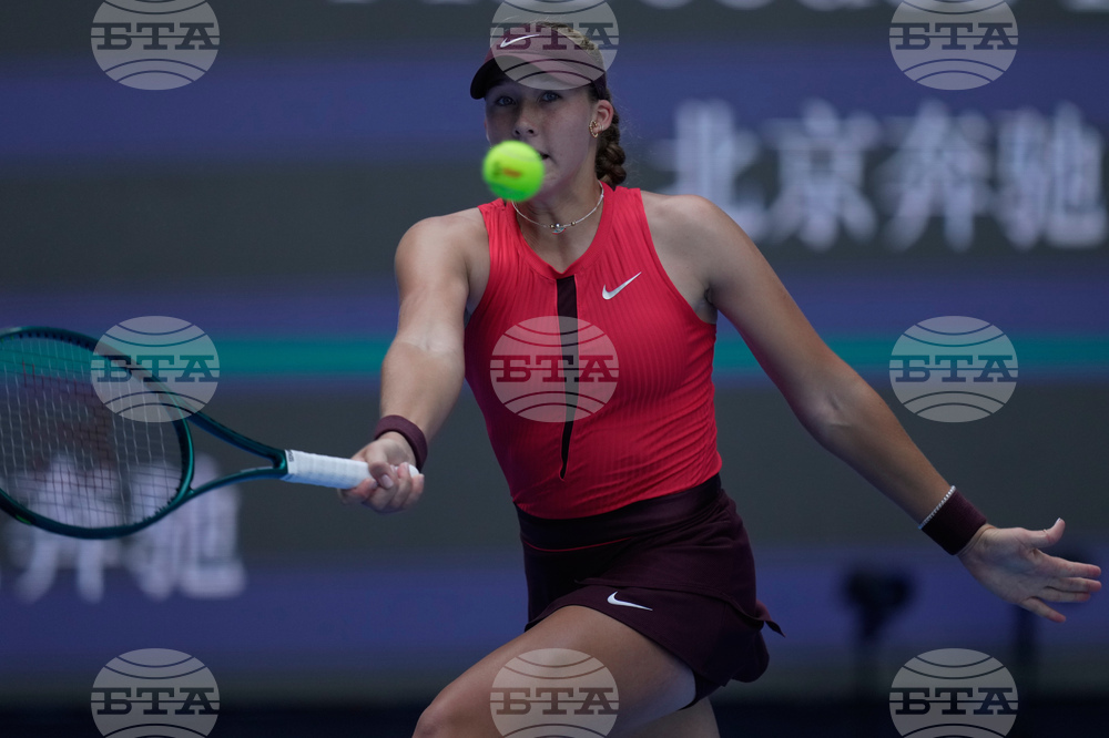 Lois Boisson, of France returns a backhand shot from Emma Navarro, of the United States during the women's singles match for the China Open tennis tournament, at the National Tennis Center, in Beijing, Monday, Sept. 29, 2025. (AP Photo/Andy Wong)