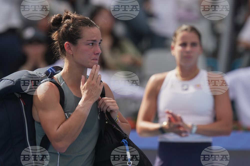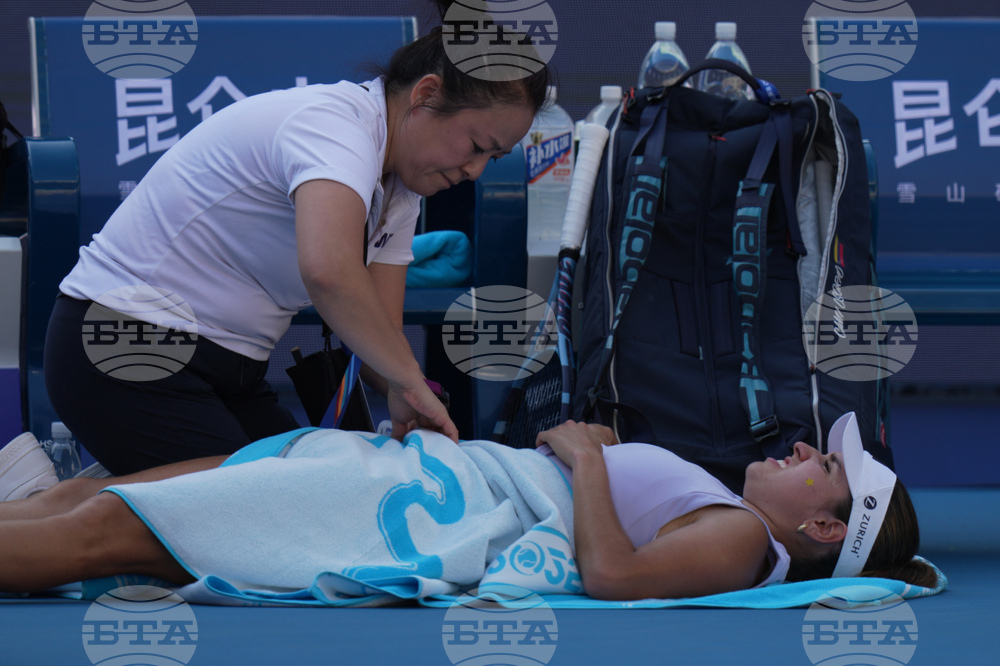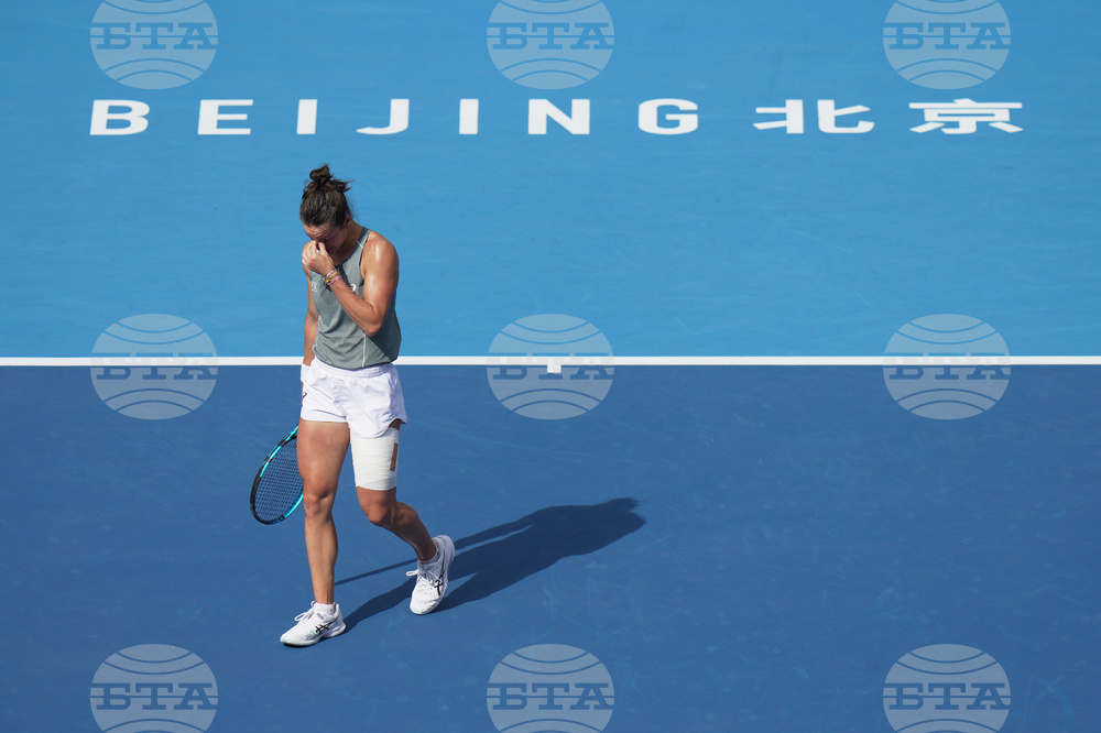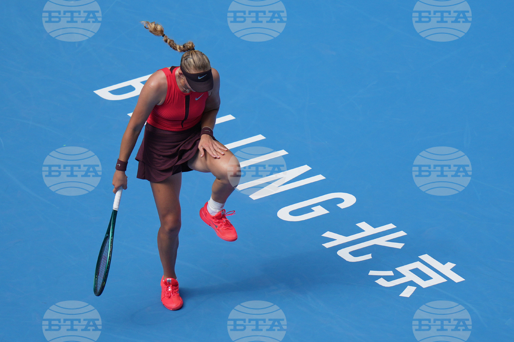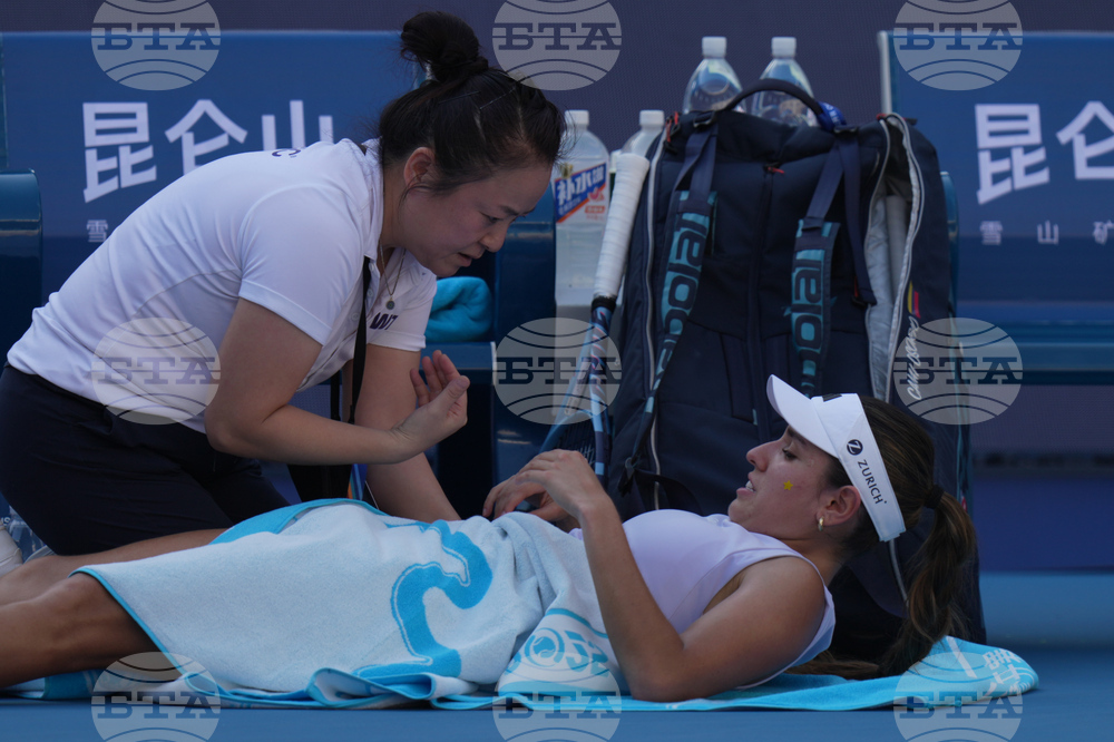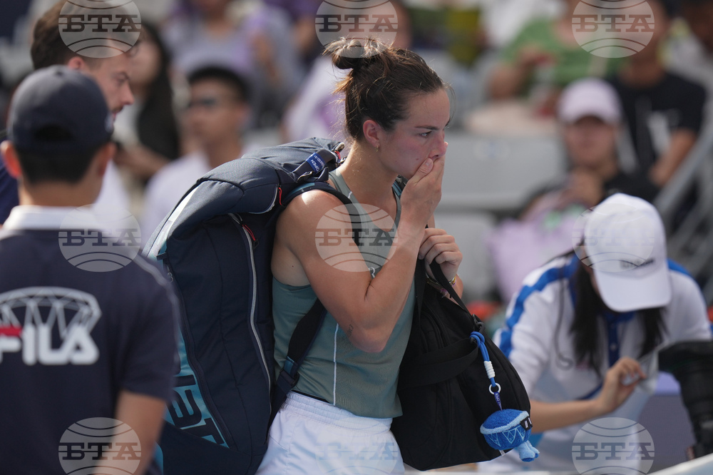 Lois Boisson, of France leaves the court after retired from the women's singles match against Emma Navarro, of the United States, at the China Open tennis tournament, in Beijing, Monday, Sept. 29, 2025. (AP Photo/Andy Wong)