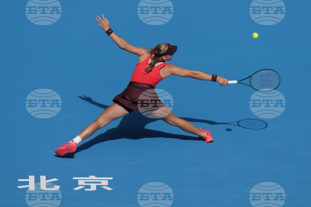 Mirra Andreeva, of Russia returns a shit from Jessica Bouzas Maneiro, of Spain during the women's singles match for the China Open tennis tournament, at the National Tennis Center, in Beijing, Monday, Sept. 29, 2025. (AP Photo/Andy Wong)