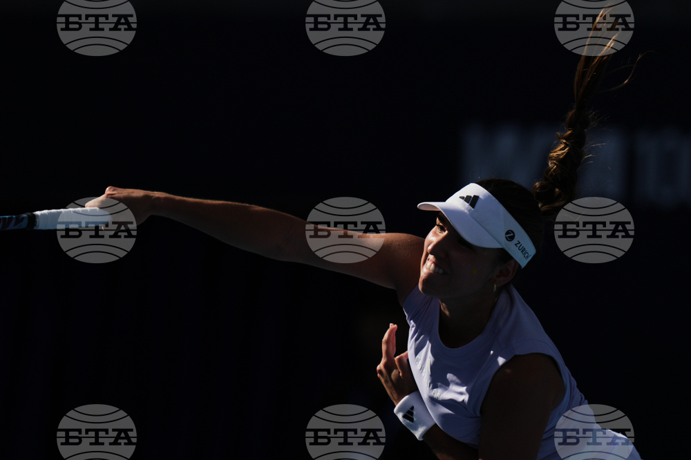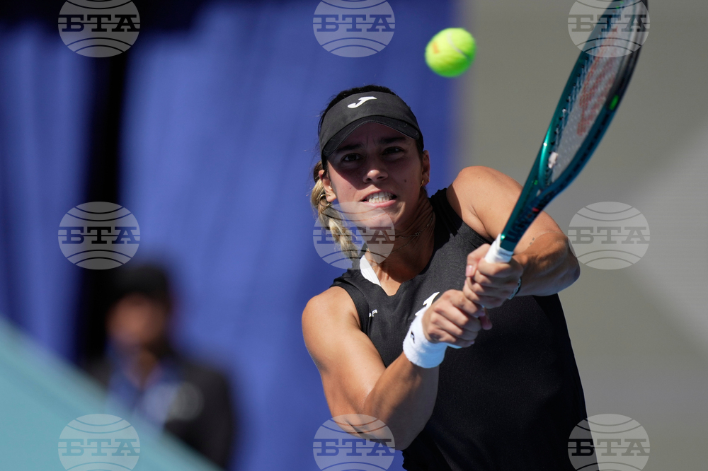 Paula Badosa of Spain plays a backhand return to Karolina Muchova, of the Czech Republic during a women's singles match of the China Open tennis tournament, at the National Tennis Center, in Beijing, China, Sunday, Sept. 28, 2025. (AP Photo/Mahesh Kumar A.)
