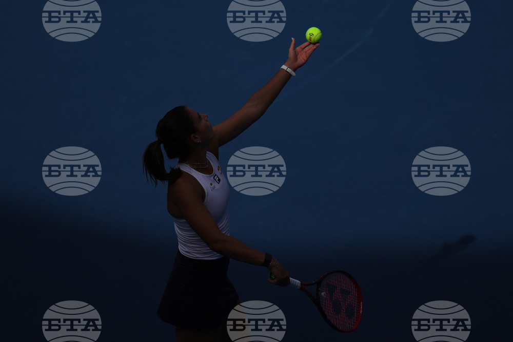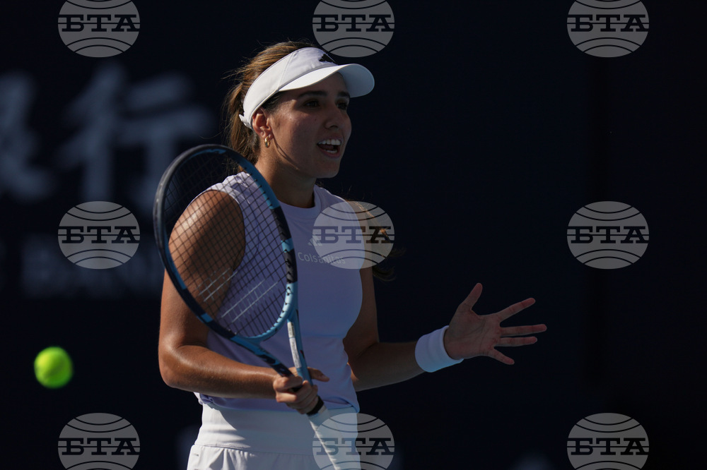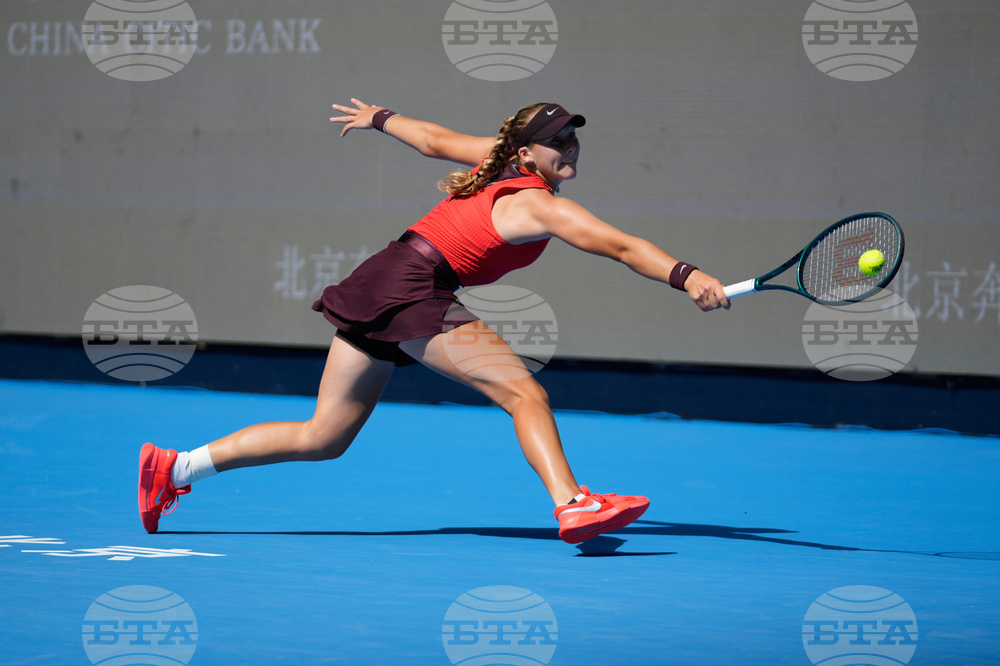 Jessica Bouzas Maneiro, of Spain plays against Mirra Andreeva, of Russia during the women's singles match for the China Open tennis tournament, at the National Tennis Center, in Beijing, Monday, Sept. 29, 2025. (AP Photo/Andy Wong)
