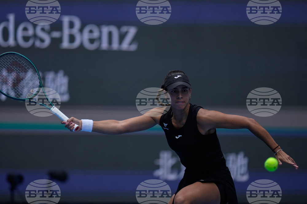 Jessica Bouzas Maneiro, of Spain returns a forehand shot to Mirra Andreeva of Russia during a women's singles match of the China Open tennis tournament, at the National Tennis Center, in Beijing, China, Monday, Sept. 29, 2025. (AP Photo/Mahesh Kumar A.)