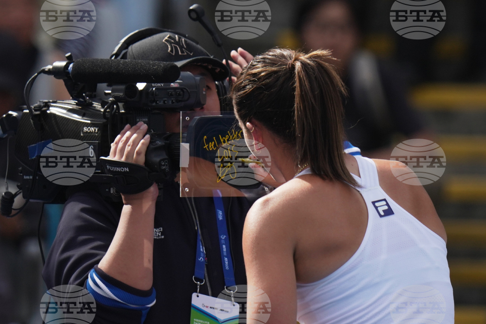 Emma Navarro, of the United States signs her autograph onto a TV camera filter after Lois Boisson, of France retired from the women's singles match for the China Open tennis tournament, at the National Tennis Center, in Beijing, Monday, Sept. 29, 2025. (AP Photo/Andy Wong)