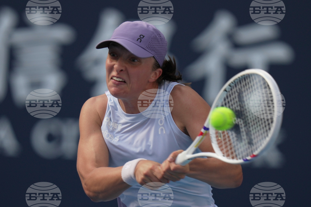 Iga Swiatek, of Poland plays a backhand return to Camila Osorio, of Colombia during the women's singles match for the China Open tennis tournament, at the National Tennis Center, in Beijing, Monday, Sept. 29, 2025. (AP Photo/Andy Wong)