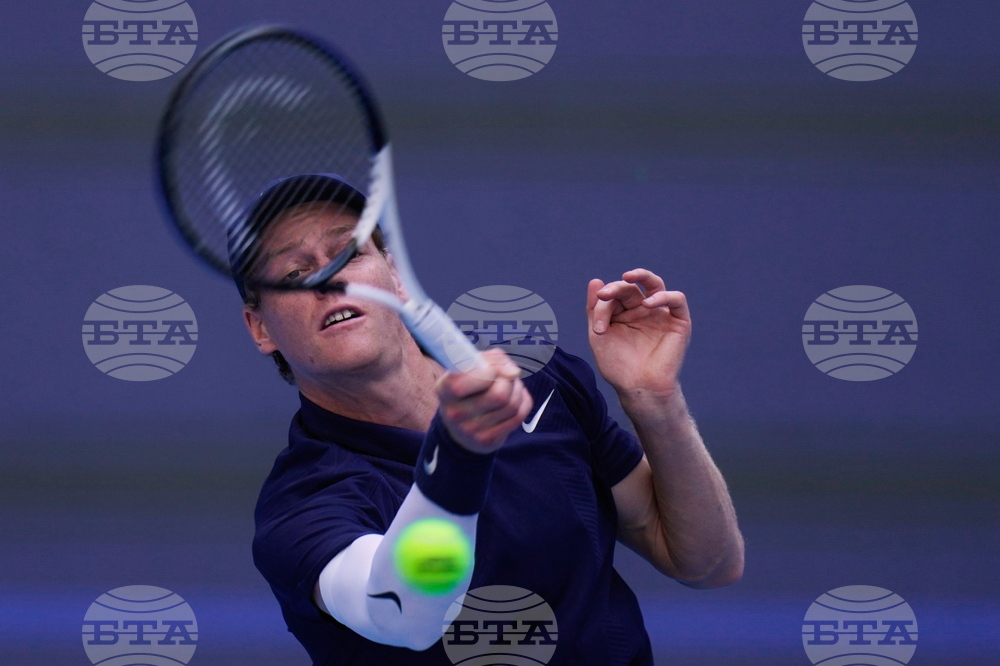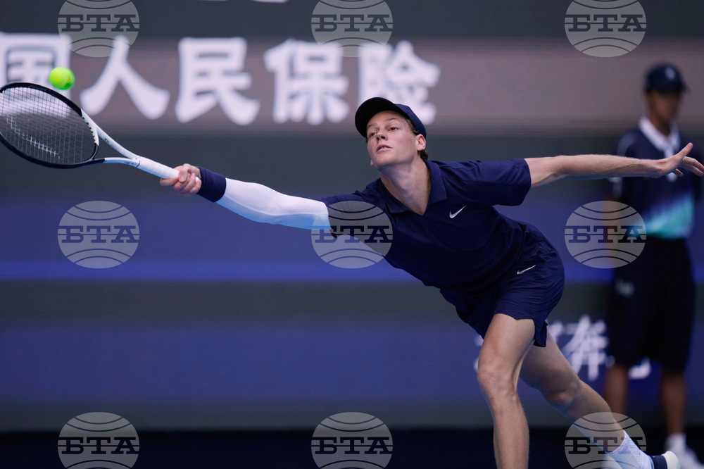 Jannik Sinner of Italy returns a backhand shot to Fabian Marozsan, of Hungary during a men's singles match of the China Open tennis tournament, at the National Tennis Center, in Beijing, China, Monday, Sept. 29, 2025. (AP Photo/Mahesh Kumar A.)