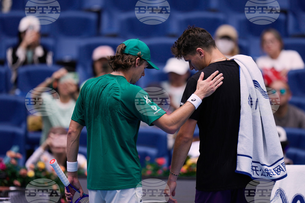 Jakub Mensik of the Czech Republic, right, talks to Alex De Minaur of Australia at the net after he retired from their men's singles match of the China Open tennis tournament, at the National Tennis Center, in Beijing, China, Monday, Sept. 29, 2025. (AP Photo/Mahesh Kumar A.)