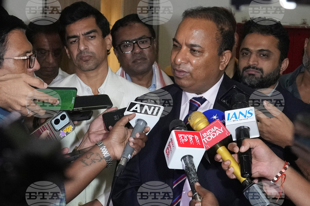 Board of Control for Cricket in India (BCCI)'s newly elected President Mithun Manhas, center, speaks with reporters as he leaves after attending the annual general meeting at the BCCI headquarters in Mumbai, India, Sunday, Sept. 28, 2025. (AP Photo/Rafiq Maqbool)