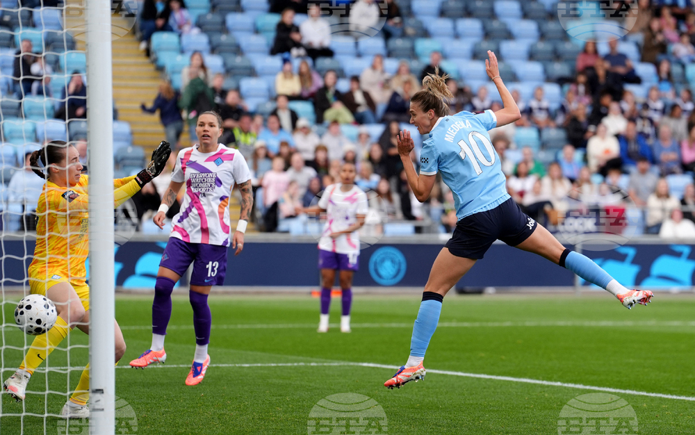 Manchester City's Vivianne Miedema, right, scores during the Women's Super League soccer match between Manchester City and London City at the Manchester City Joie Stadium, Manchester, England, Sunday Sept. 28, 2025. (Martin Rickett/PA via AP)