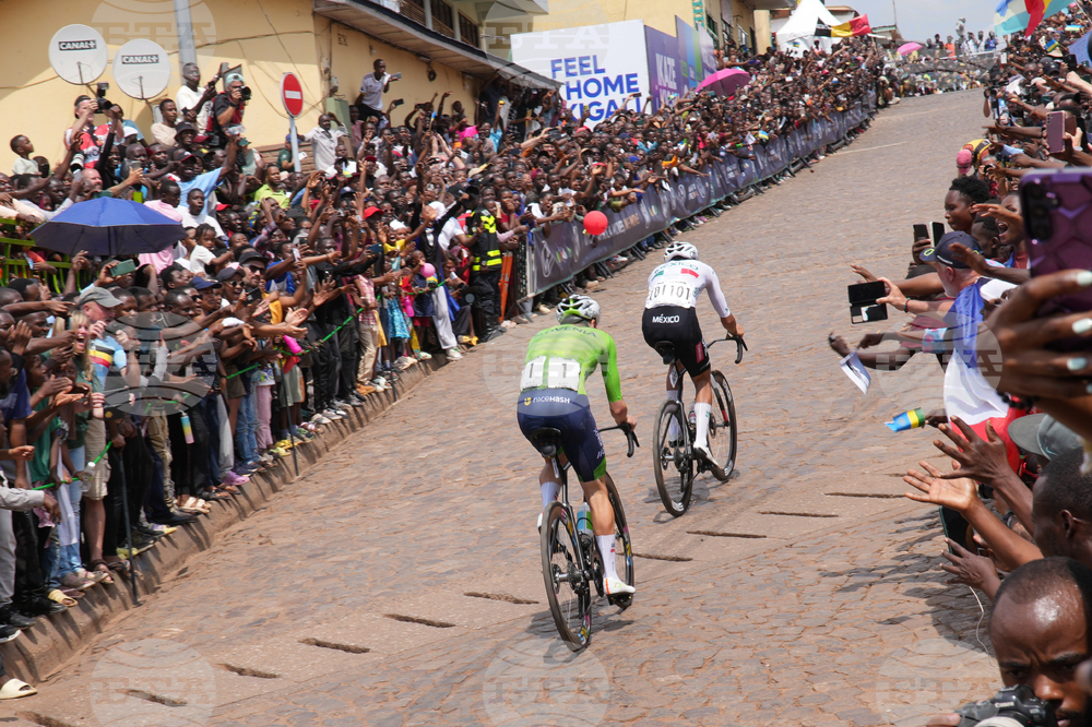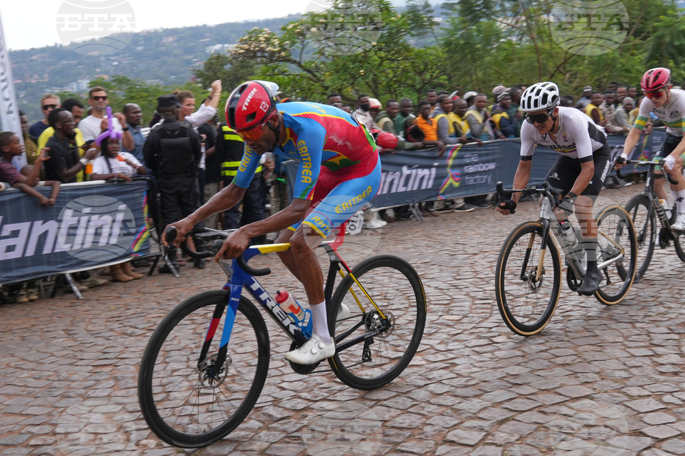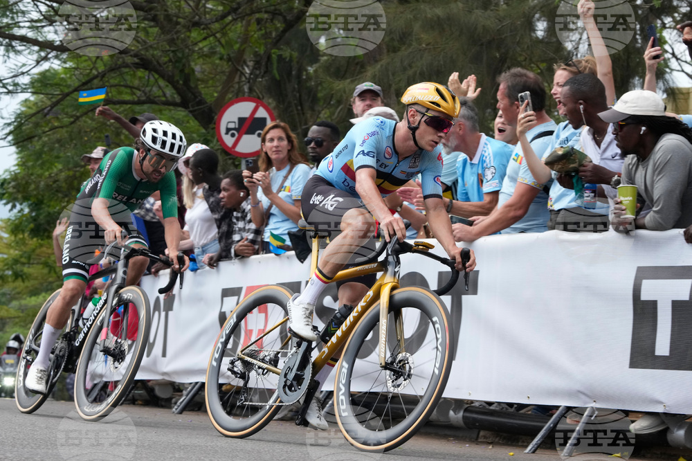 Eritrea's Amanuel Gebreigzabhie, left, pedals during the men's Elite road race, at the road cycling World Championships in Kigali, Rwanda, Sunday, Sept. 28, 2025. (AP Photo/Jerome Delay)