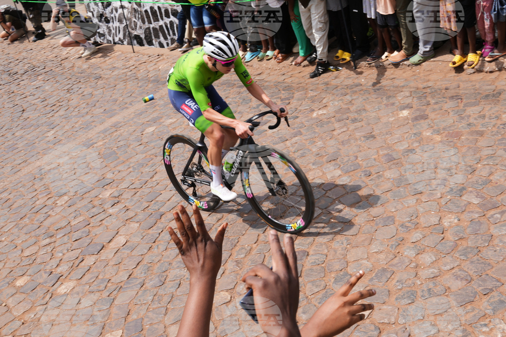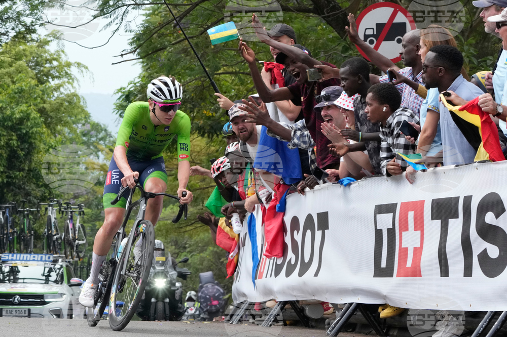 Slovenia's Tadej Pogacar is cheered by spectators as he pedals during the men's Elite road race, at the road cycling World Championships in Kigali, Rwanda, Sunday, Sept. 28, 2025. (AP Photo/Jerome Delay)