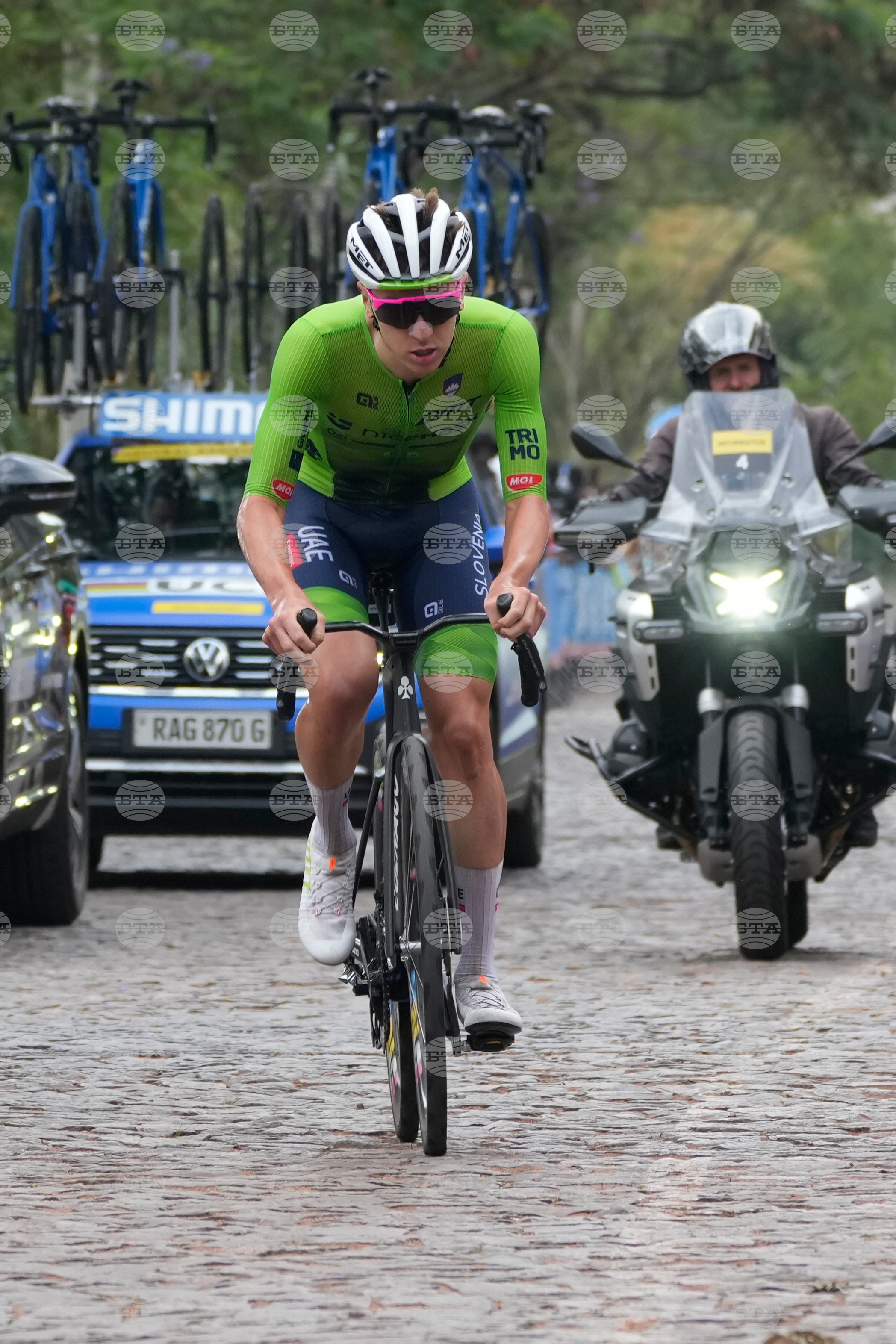 Slovenia's Tadej Pogacar leads the men's Elite road race, at the road cycling World Championships in Kigali, Rwanda, Sunday, Sept. 28, 2025. (AP Photo/Jerome Delay)