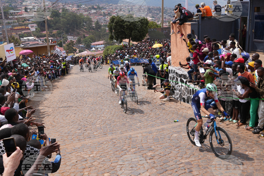 Riders pedal during the men's Elite road race, at the road cycling World Championships in Kigali, Rwanda, Sunday, Sept. 28, 2025. (AP Photo/Jerome Delay)