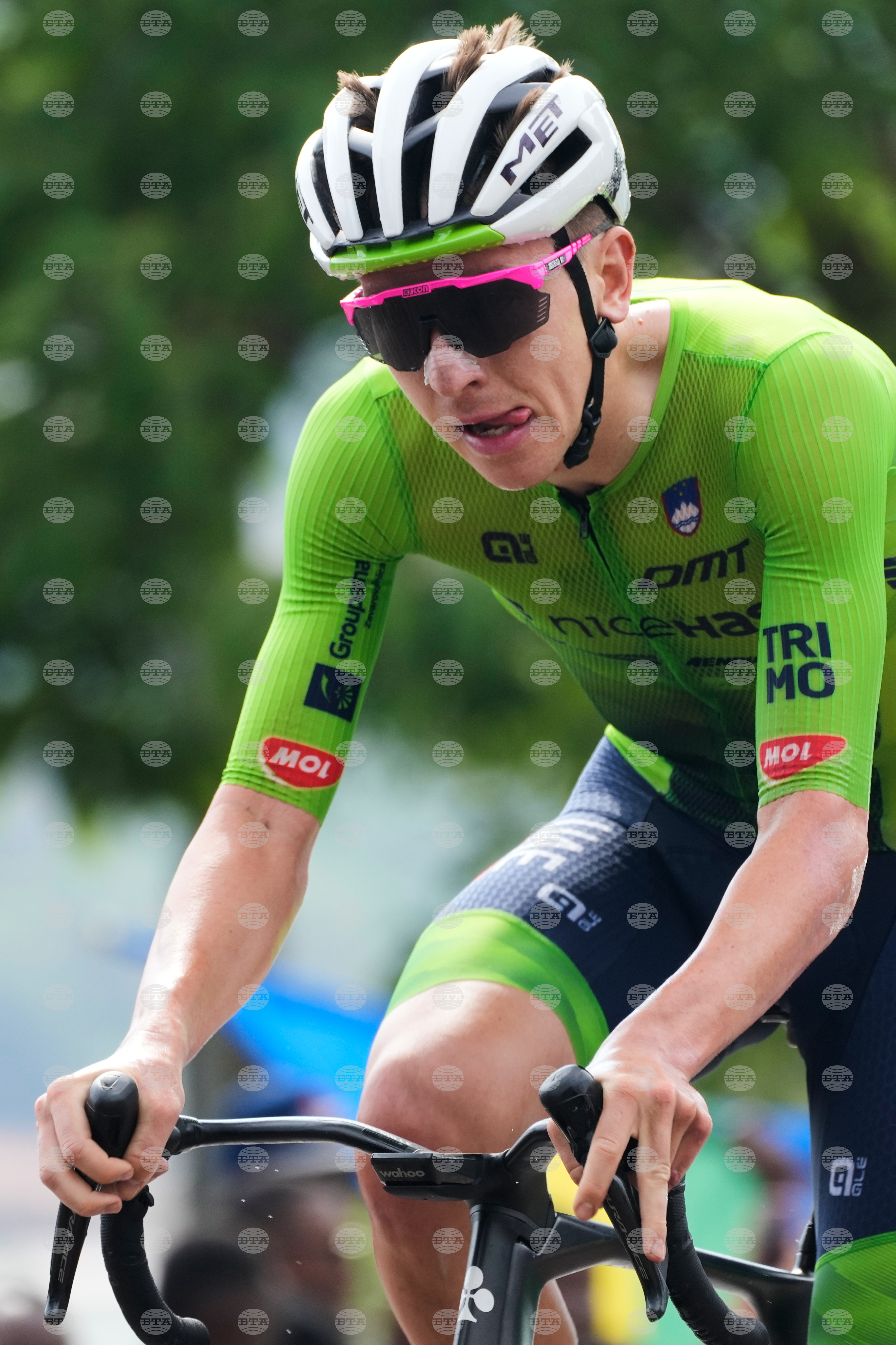 Slovenia's Tadej Pogacar bites his tongue as he pedals during the men's Elite road race, at the road cycling World Championships in Kigali, Rwanda, Sunday, Sept. 28, 2025. (AP Photo/Jerome Delay)