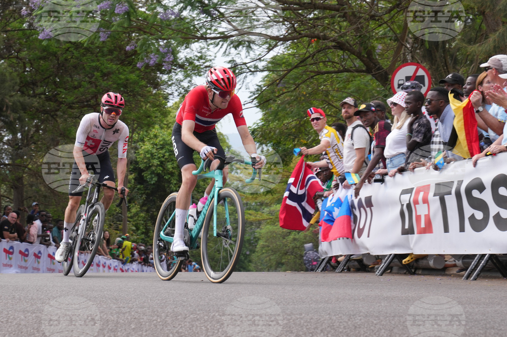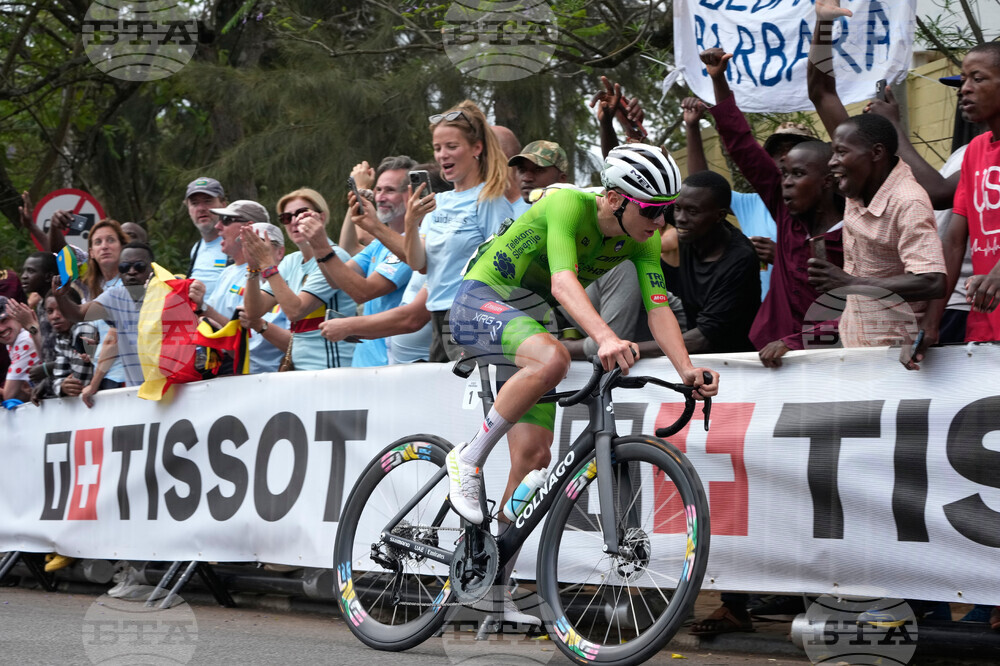 Switzerland's Jan Christen pedals during the men's Elite road race, at the road cycling World Championships in Kigali, Rwanda, Sunday, Sept. 28, 2025. (AP Photo/Jerome Delay)