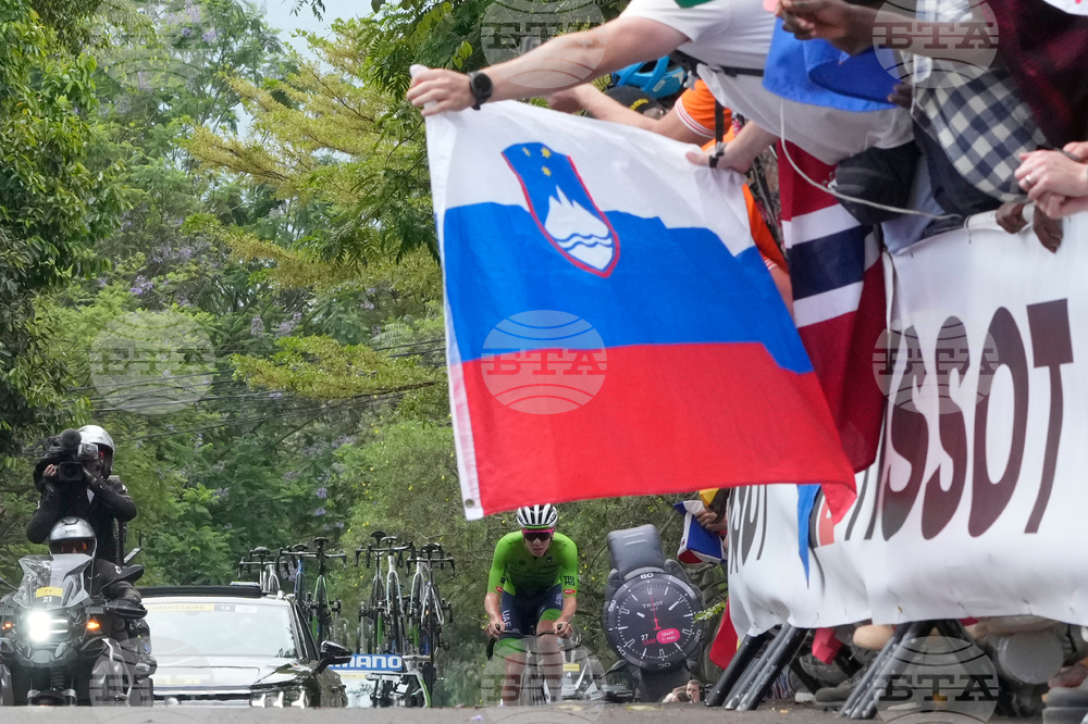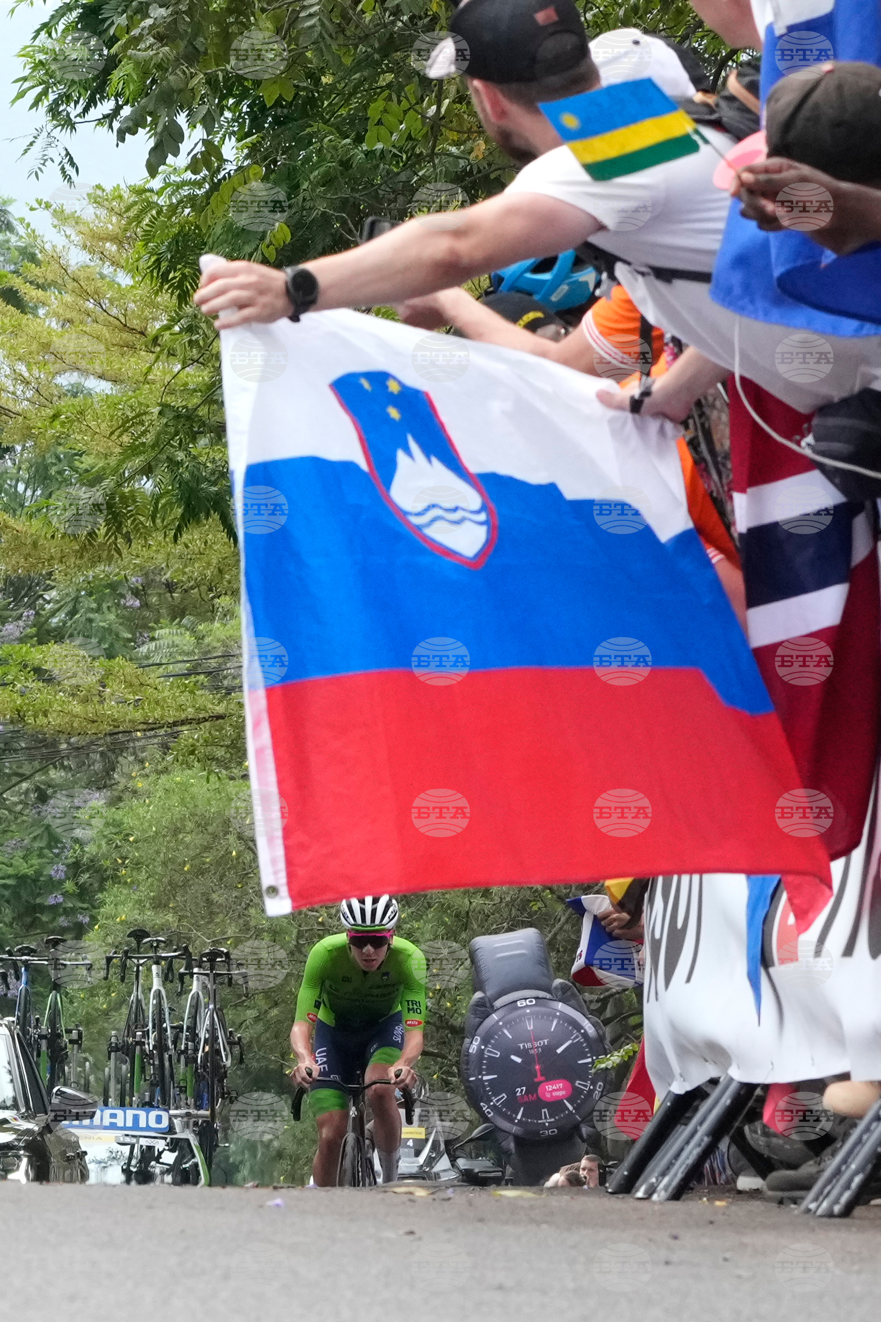 Slovenia's Tadej Pogacar is framed by a Slovenian flag as he leads the men's Elite road race, at the road cycling World Championships in Kigali, Rwanda, Sunday, Sept. 28, 2025. (AP Photo/Jerome Delay)