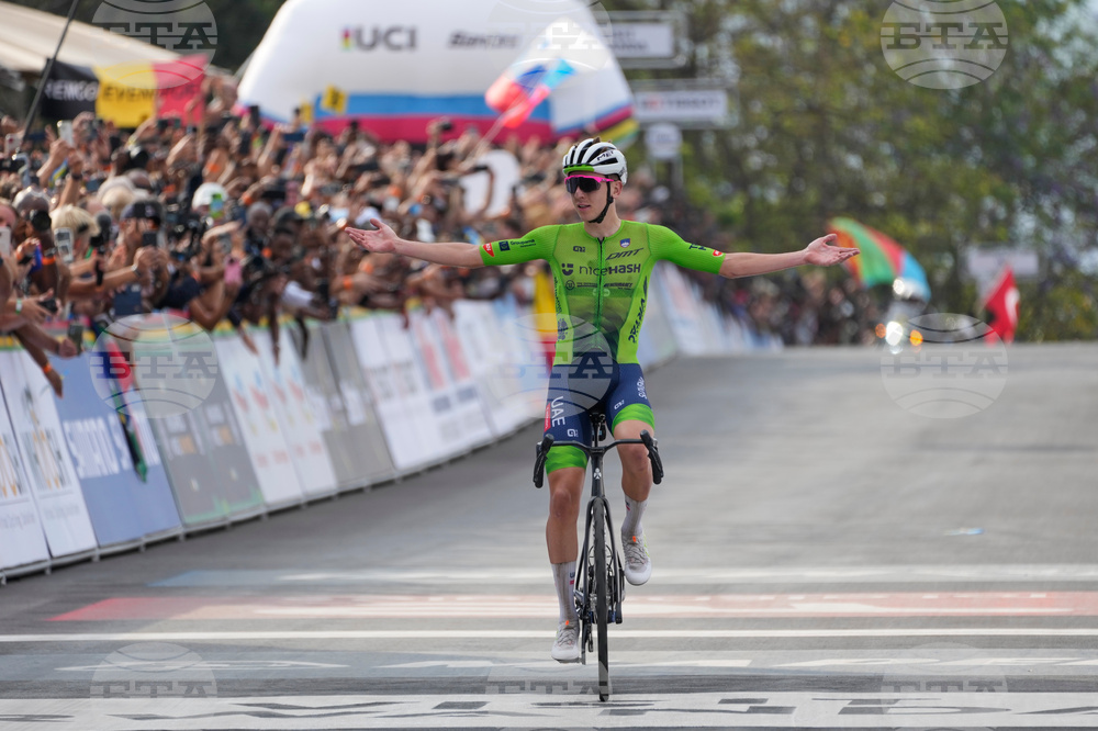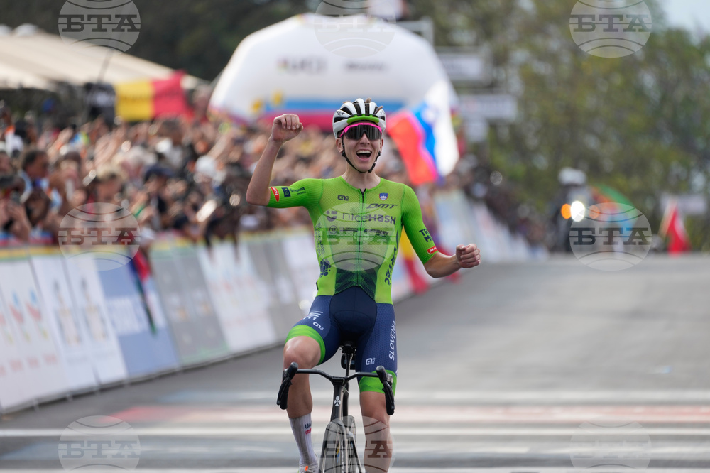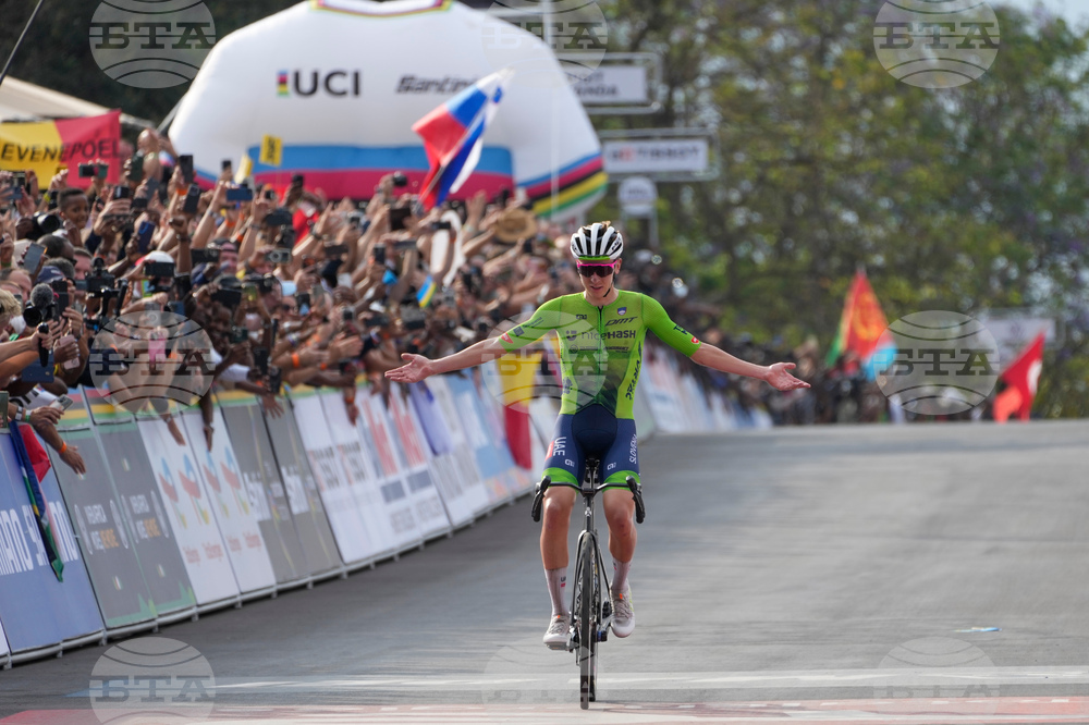 Slovenia's Tadej Pogacar celebrates winning the men's Elite road race, at the road cycling World Championships in Kigali, Rwanda, Sunday, Sept. 28, 2025. (AP Photo/Jerome Delay)
