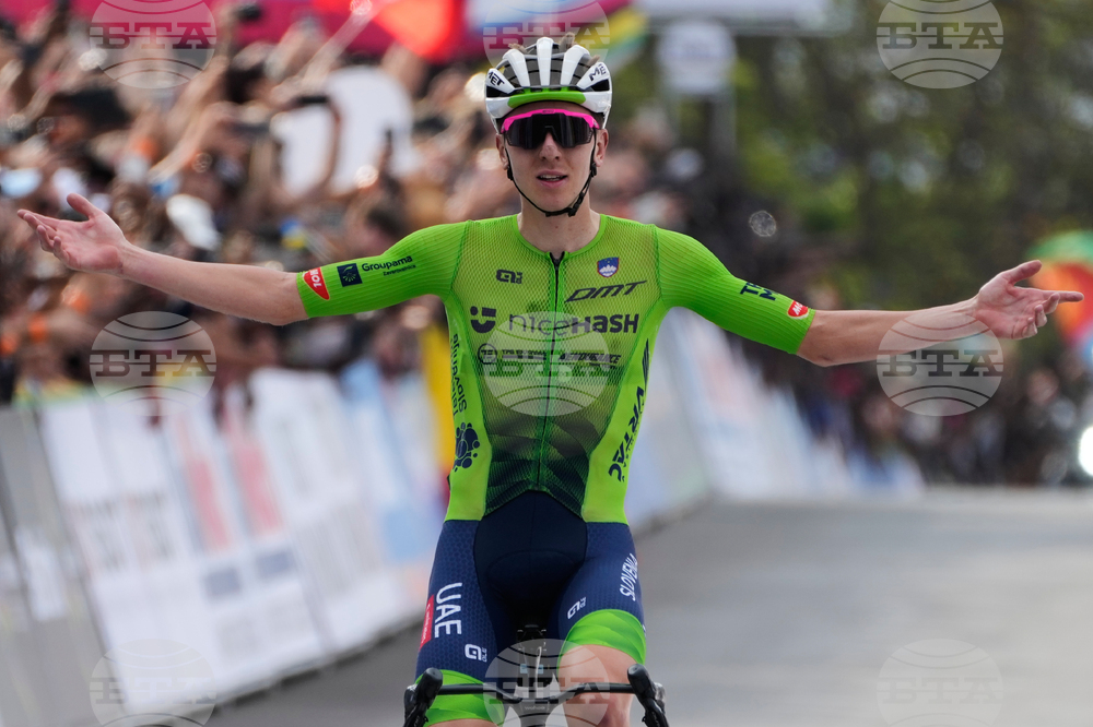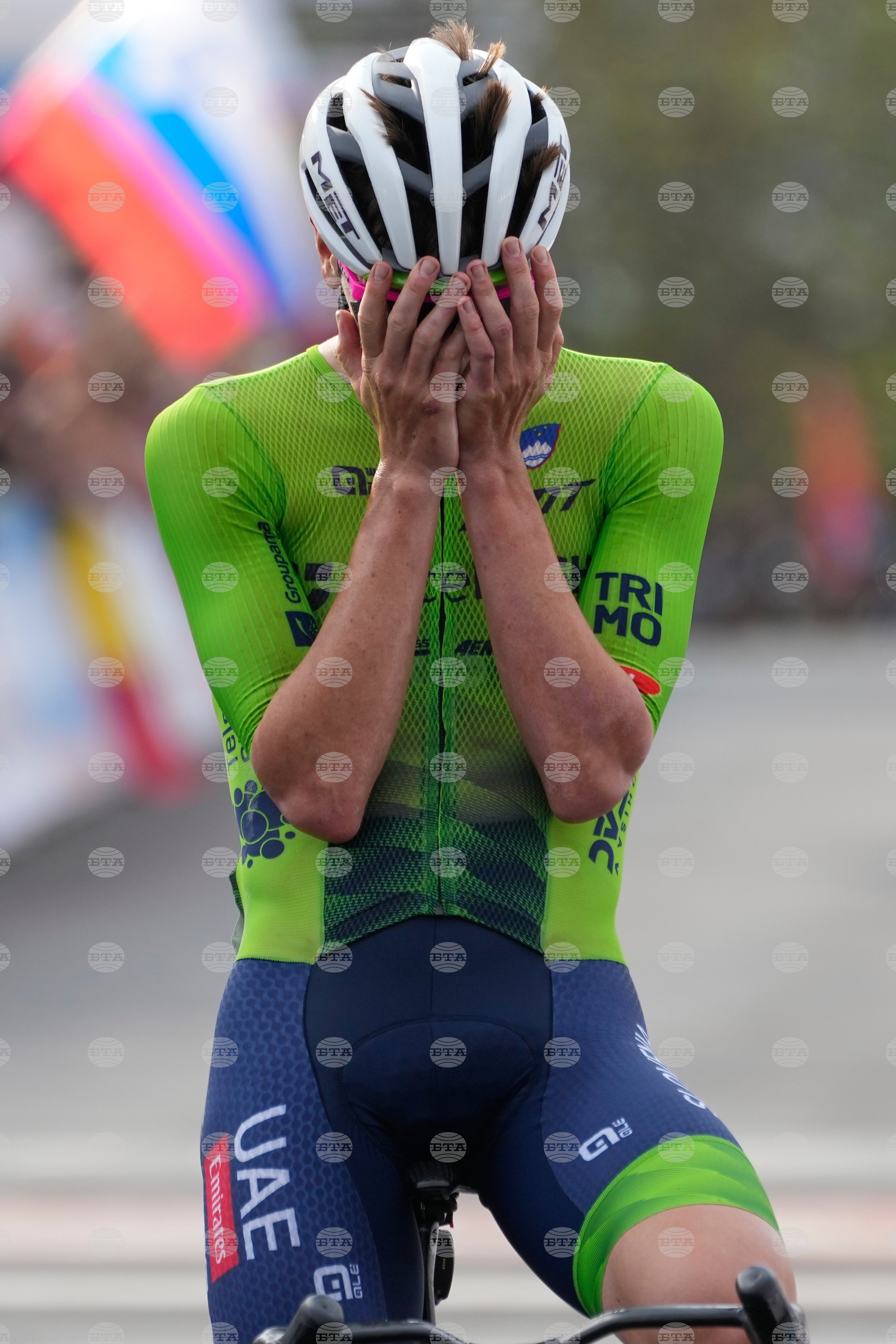 Slovenia's Tadej Pogacar reacts as he crosses the finish line to win the men's Elite road race, at the road cycling World Championships in Kigali, Rwanda, Sunday, Sept. 28, 2025. (AP Photo/Jerome Delay)