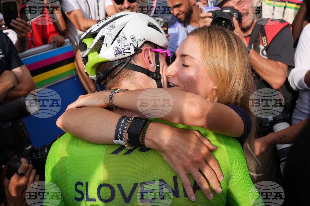 Slovenia's Tadej Pogacar celebrates with his partner Urska Zigart after winning the men's Elite road race, at the road cycling World Championships in Kigali, Rwanda, Sunday, Sept. 28, 2025. (AP Photo/Jerome Delay)