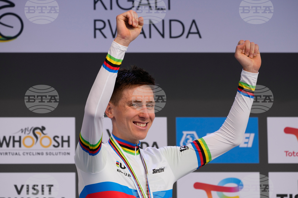 Slovenia's Tadej Pogacar pedals during the last lap of the men's Elite road race, at the road cycling World Championships in Kigali, Rwanda, Sunday, Sept. 28, 2025. (AP Photo/Jerome Delay)
