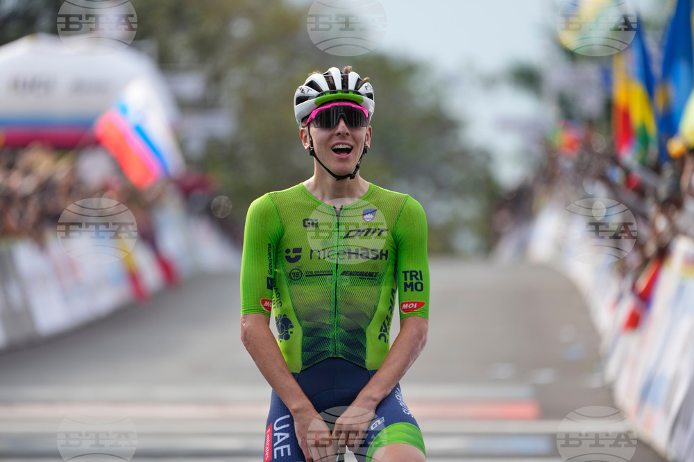Australia's Jai Hindley pedals during the men's Elite road race, at the road cycling World Championships in Kigali, Rwanda, Sunday, Sept. 28, 2025. (AP Photo/Jerome Delay)