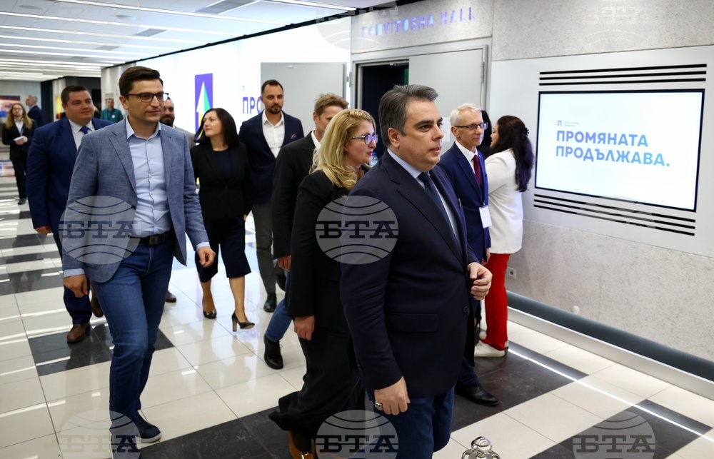 София (28 септември 2025) Брифинг на новоизбраното ръководство на „Продължаваме промяната“ се провежда в Интер експо център. На снимката: председателят на ,,Продължаваме промяната" Асен Василев (в средата).