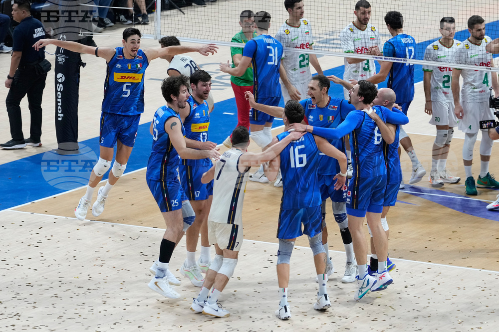 Team Italy celebrates after defeating Bulgaria in their final match at the 2025 FIVB Volleyball Men's World Championship at the Mall of Asia Arena, Pasay city, Philippines on Sunday, Sept. 28, 2025. (AP Photo/Aaron Favila)