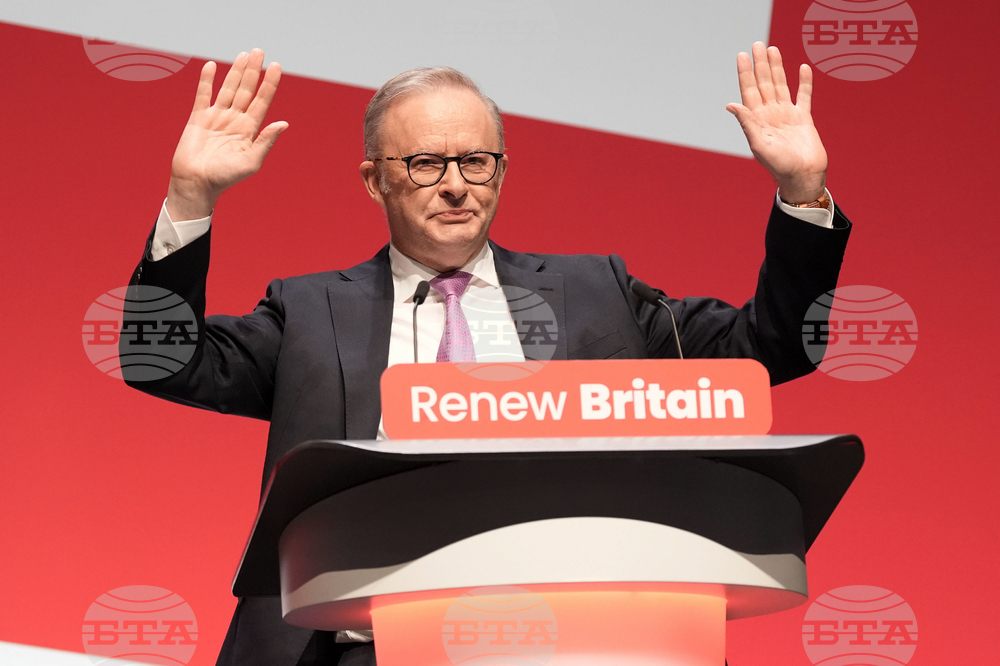 Britain's Prime Minister Keir Starmer and Australian Prime Minister Anthony Albanese, right, attend the Labour Party Conference in Liverpool, England, Sunday Sept. 28, 2025. (Stefan Rousseau/PA via AP)