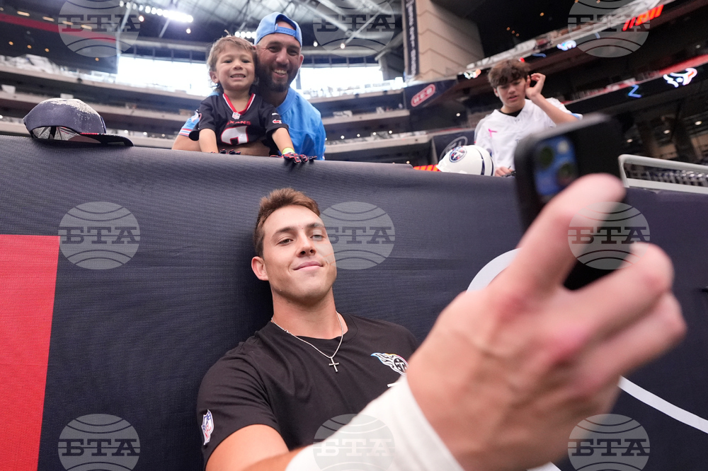 Tennessee Titans tight end Gunnar Helm, below, takes picture with Blas Lopez, 5, and his father Rudy Lopez before an NFL football game against the Houston Texans, Sunday, Sept. 28, 2025, in Houston. (AP Photo/David J. Phillip)