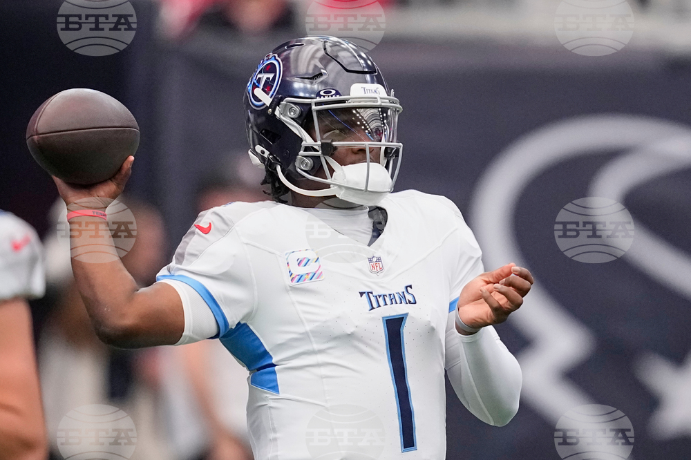 Tennessee Titans quarterback Cam Ward warms up before an NFL football game against the Houston Texans, Sunday, Sept. 28, 2025, in Houston. (AP Photo/David J. Phillip)