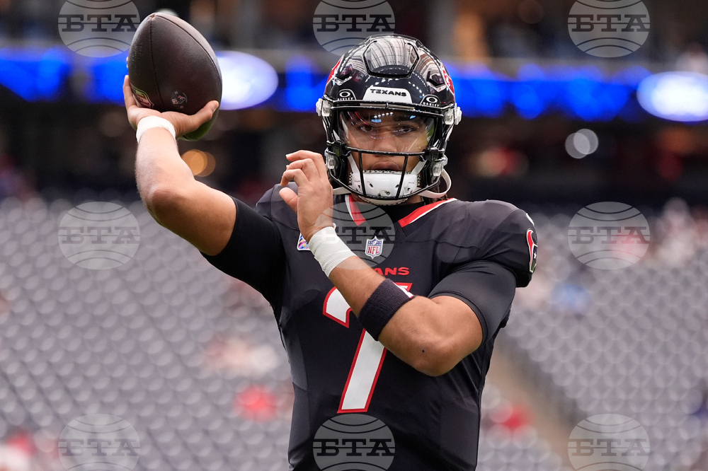 Houston Texans quarterback C.J. Stroud (7) warms up before an NFL football game against the Tennessee Titans, Sunday, Sept. 28, 2025, in Houston. (AP Photo/Ashley Landis)