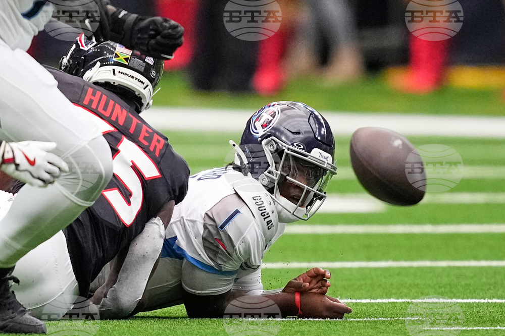 Tennessee Titans quarterback Cam Ward (1) loses the ball after being pressured by Houston Texans defensive end Danielle Hunter, left, during the first half of an NFL football game Sunday, Sept. 28, 2025, in Houston. (AP Photo/David J. Phillip)