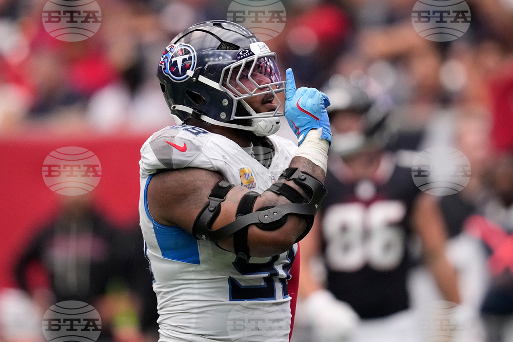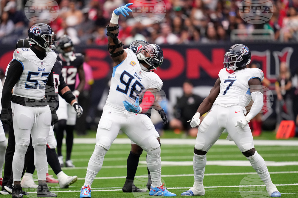 Tennessee Titans linebackers Arden Key, left, and Dre'Mont Jones, right, sack Houston Texans quarterback C.J. Stroud (7) during the first half of an NFL football game Sunday, Sept. 28, 2025, in Houston. (AP Photo/David J. Phillip)