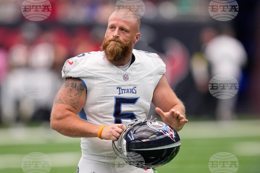 Tennessee Titans place-kicker Joey Slye, second from left, reacts after missing a field goal attempt during the first half of an NFL football game against the Houston Texans, Sunday, Sept. 28, 2025, in Houston. (AP Photo/Ashley Landis)