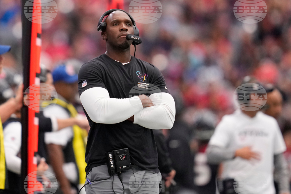 Houston Texans head coach DeMeco Ryans looks onto the field during the second half of an NFL football game against the Tennessee Titans, Sunday, Sept. 28, 2025, in Houston. (AP Photo/Ashley Landis)