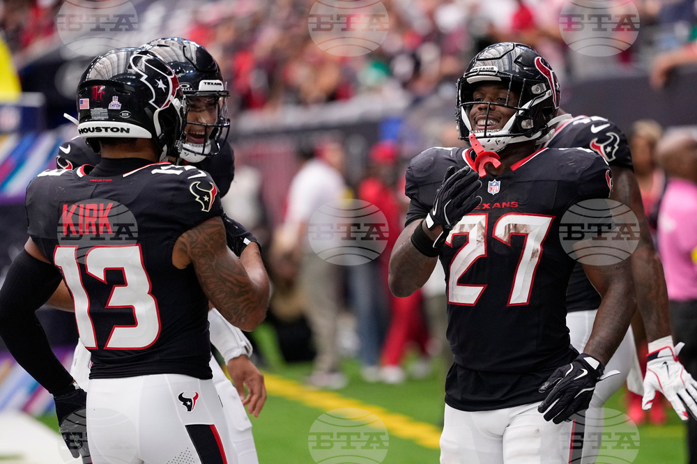 Houston Texans running back Woody Marks (27) celebrates his touchdown with wide receiver Christian Kirk (13) and quarterback C.J. Stroud, center, during the second half of an NFL football game against the Tennessee Titans, Sunday, Sept. 28, 2025, in Houston. (AP Photo/David J. Phillip)