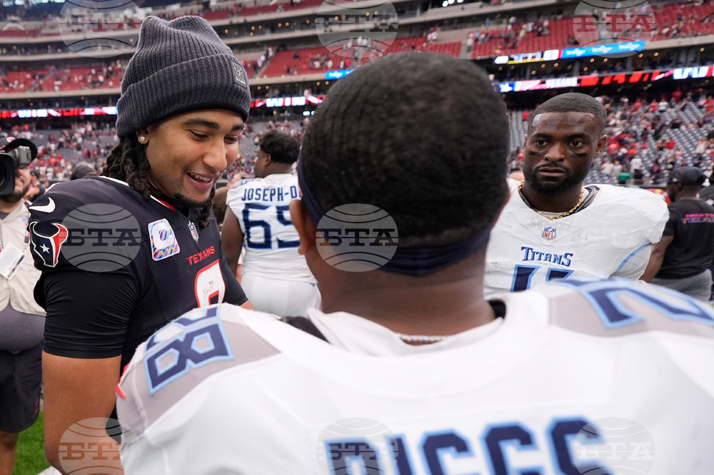 Houston Texans quarterback C.J. Stroud, left, speaks to Tennessee Titans safety Quandre Diggs, center, and wide receiver Van Jefferson, right, after an NFL football game Sunday, Sept. 28, 2025, in Houston. (AP Photo/Ashley Landis)