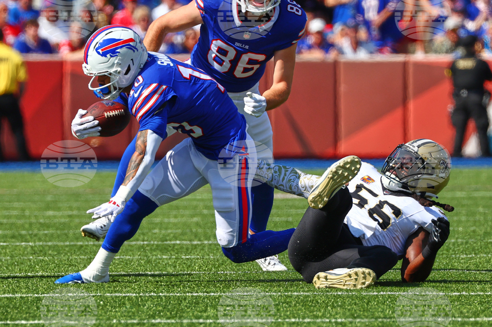 Buffalo Bills wide receiver Khalil Shakir (10) carries against New Orleans Saints linebacker Pete Werner (20) in the first half of an NFL football game, Sunday, Sept. 28, 2025, in Orchard Park, N.Y. (AP Photo/Sue Ogrocki)