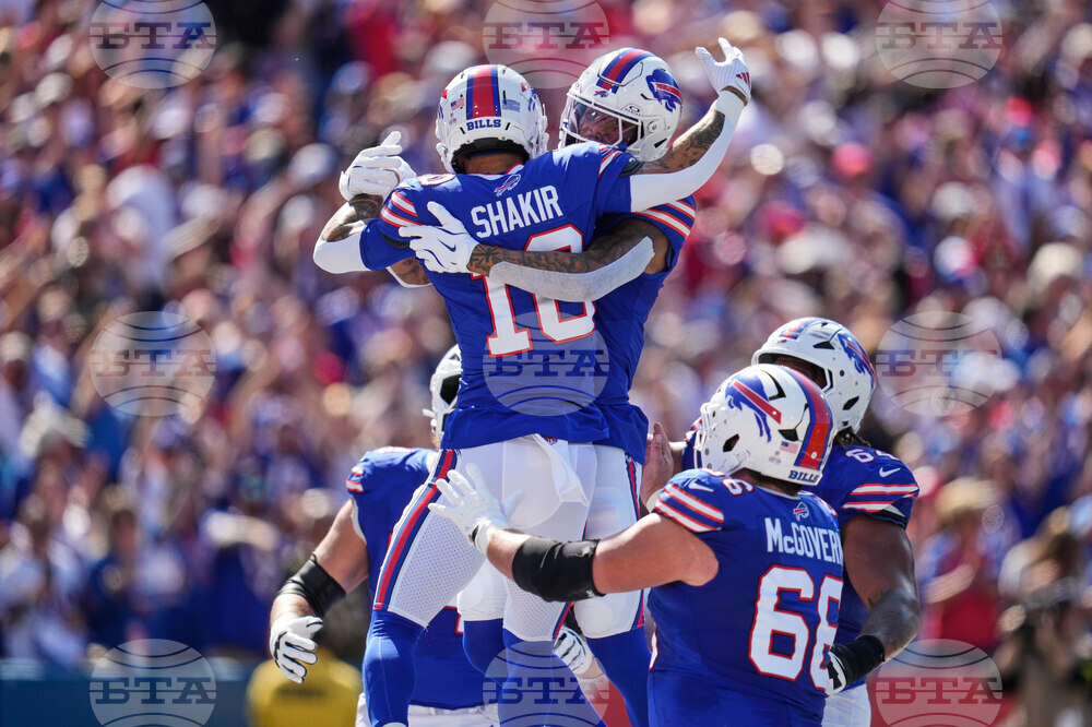 Buffalo Bills wide receiver Khalil Shakir, right, celebrates his touchdown against the New Orleans Saints in the first half of an NFL football game, Sunday, Sept. 28, 2025, in Orchard Park, N.Y. (AP Photo/Jeffrey T. Barnes)
