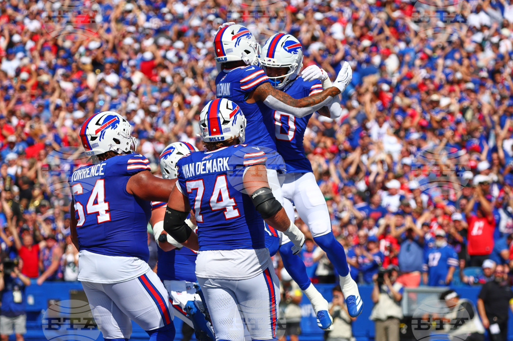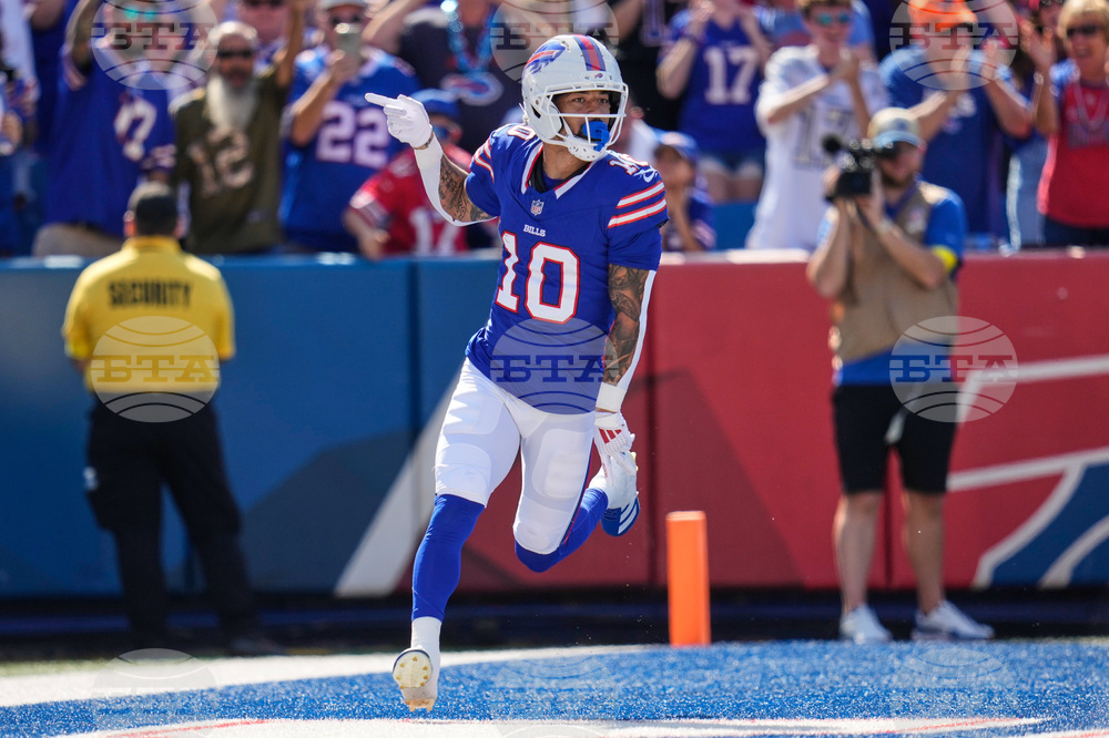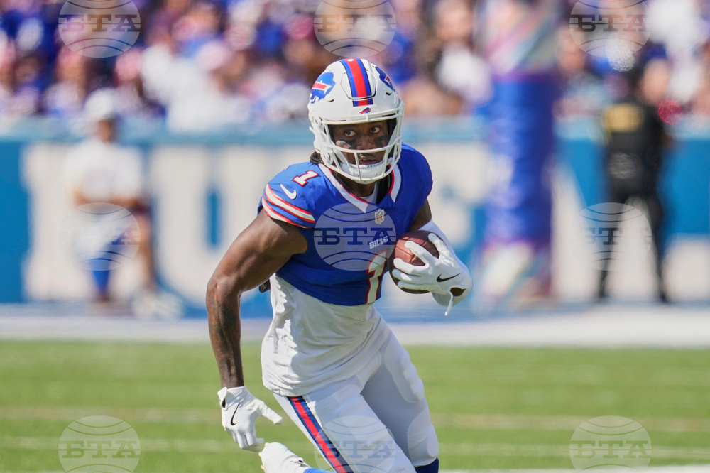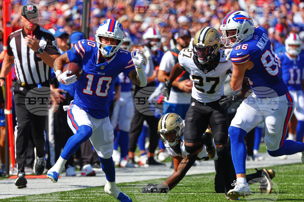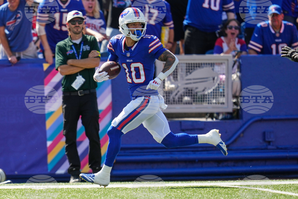 Buffalo Bills wide receiver Khalil Shakir (10) carries for. A touchdown against the New Orleans Saints in the first half of an NFL football game, Sunday, Sept. 28, 2025, in Orchard Park, N.Y. (AP Photo/Sue Ogrocki)