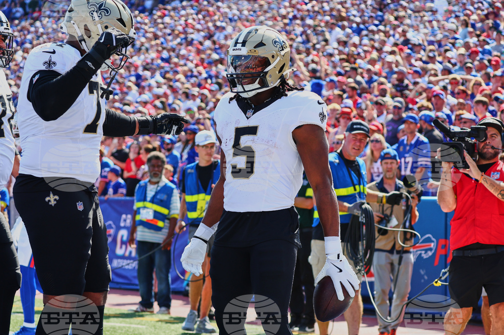 New Orleans Saints running back Kendre Miller (5) celebrates his touchdown against the Buffalo Bills in the first half of an NFL football game, Sunday, Sept. 28, 2025, in Orchard Park, N.Y. (AP Photo/Jeffrey T. Barnes)