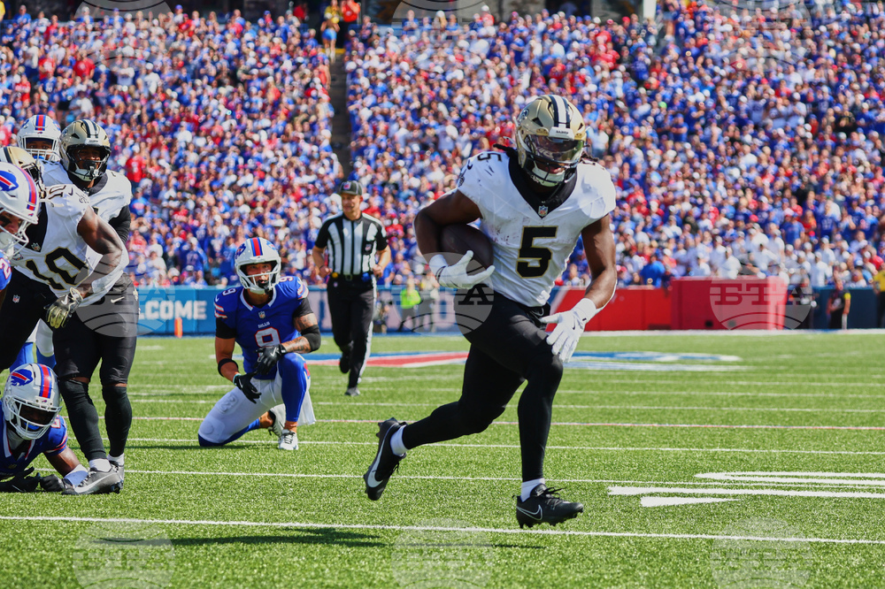 New Orleans Saints running back Kendre Miller (5) carries for a touchdown against the Buffalo Bills in the first half of an NFL football game, Sunday, Sept. 28, 2025, in Orchard Park, N.Y. (AP Photo/Sue Ogrocki)