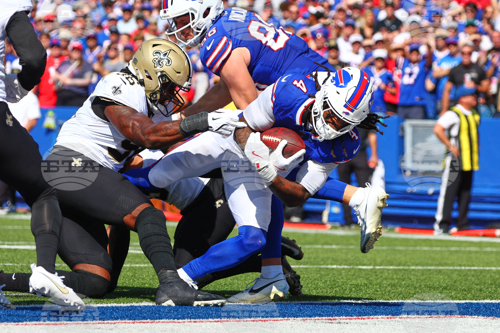 Buffalo Bills running back James Cook (4) carries for a touchdown against the New Orleans Saints in the first half of an NFL football game, Sunday, Sept. 28, 2025, in Orchard Park, N.Y. (AP Photo/Jeffrey T. Barnes)