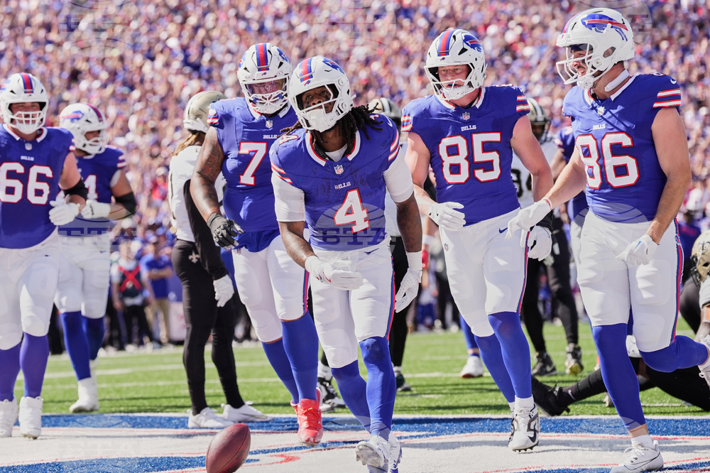 Buffalo Bills running back James Cook (4) celebrates his touchdown against the New Orleans Saints in the first half of an NFL football game, Sunday, Sept. 28, 2025, in Orchard Park, N.Y. (AP Photo/Sue Ogrocki)