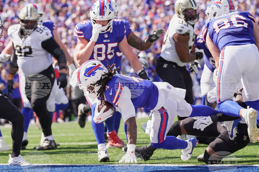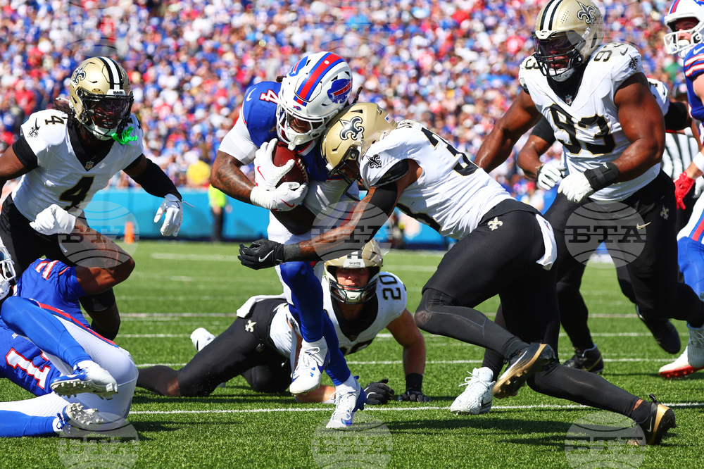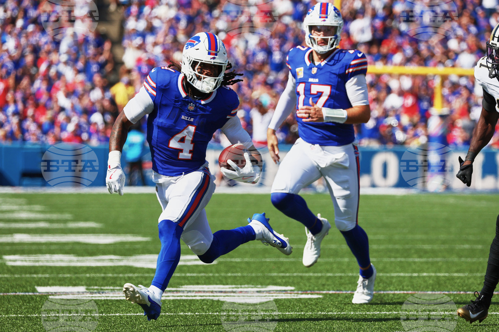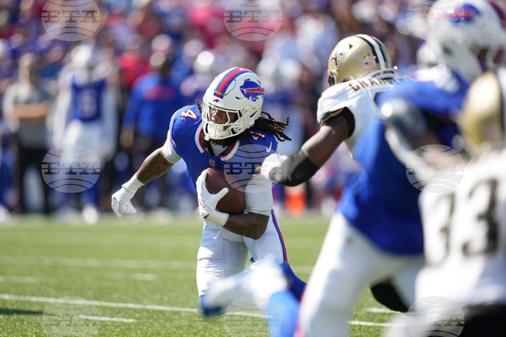 Buffalo Bills running back James Cook (4) carries against the New Orleans Saints in the first half of an NFL football game, Sunday, Sept. 28, 2025, in Orchard Park, N.Y. (AP Photo/Jeffrey T. Barnes)