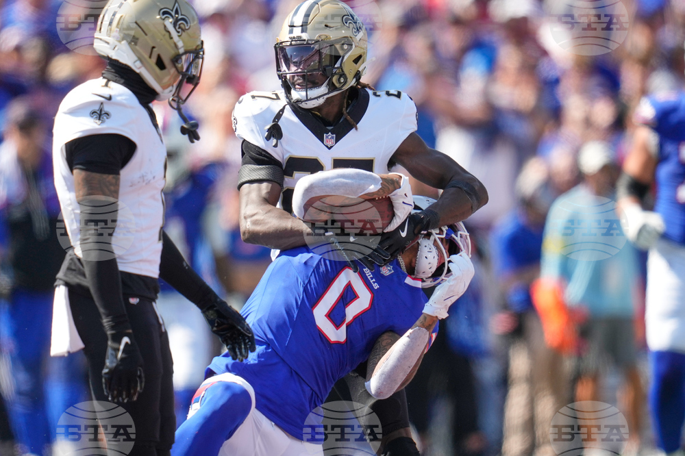 New Orleans Saints cornerback Alontae Taylor (1) stops Buffalo Bills wide receiver Khalil Shakir (10) in the second half of an NFL football game, Sunday, Sept. 28, 2025, in Orchard Park, N.Y. (AP Photo/Sue Ogrocki)