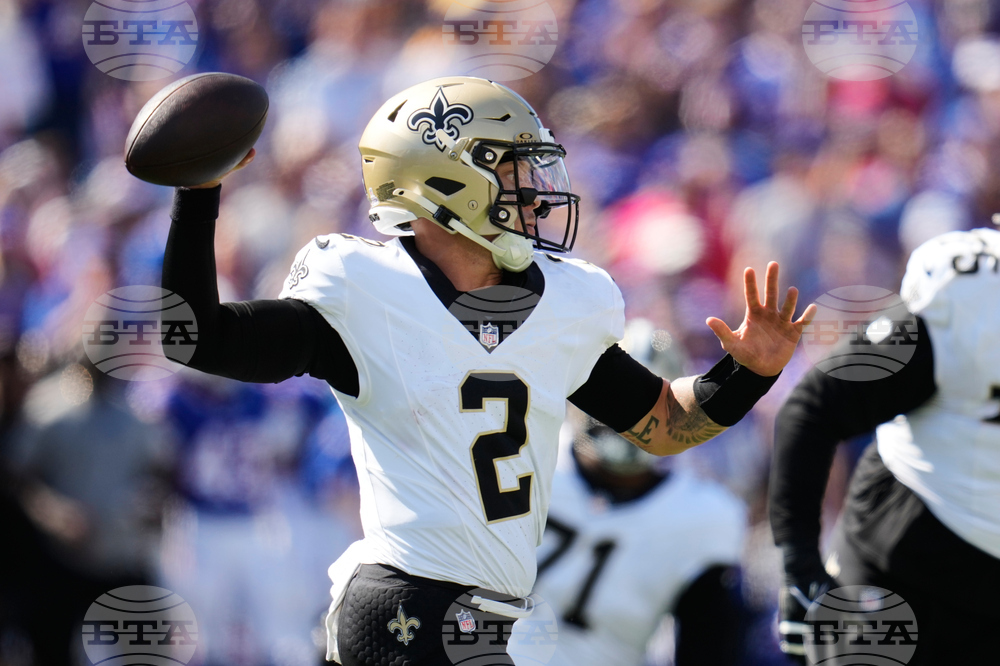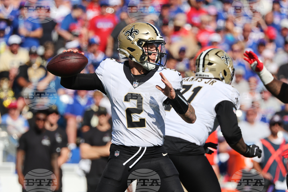 New Orleans Saints quarterback Spencer Rattler (2) passes against the Buffalo Bills in the second half of an NFL football game, Sunday, Sept. 28, 2025, in Orchard Park, N.Y. (AP Photo/Jeffrey T. Barnes)