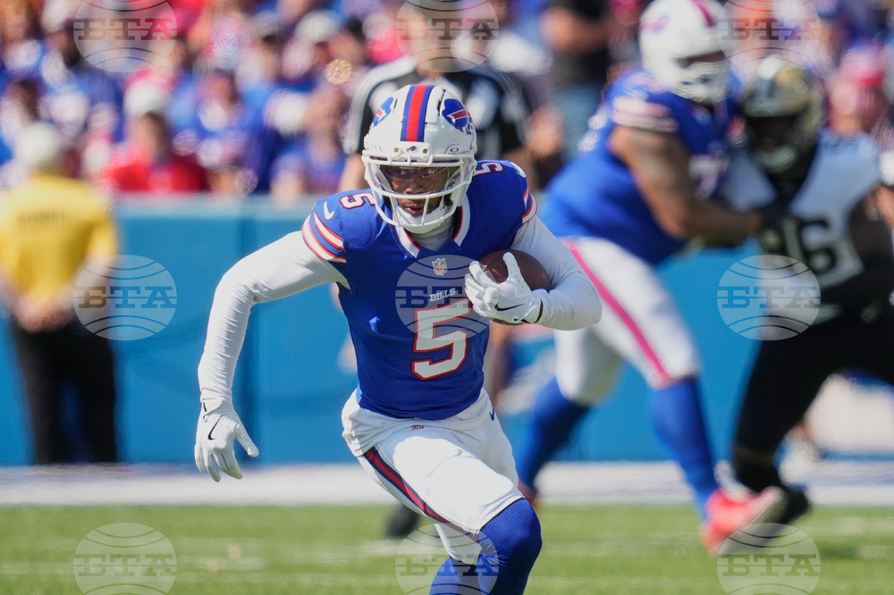 Buffalo Bills wide receiver Josh Palmer (5) carries against the New Orleans Saints in the first half of an NFL football game, Sunday, Sept. 28, 2025, in Orchard Park, N.Y. (AP Photo/Sue Ogrocki)