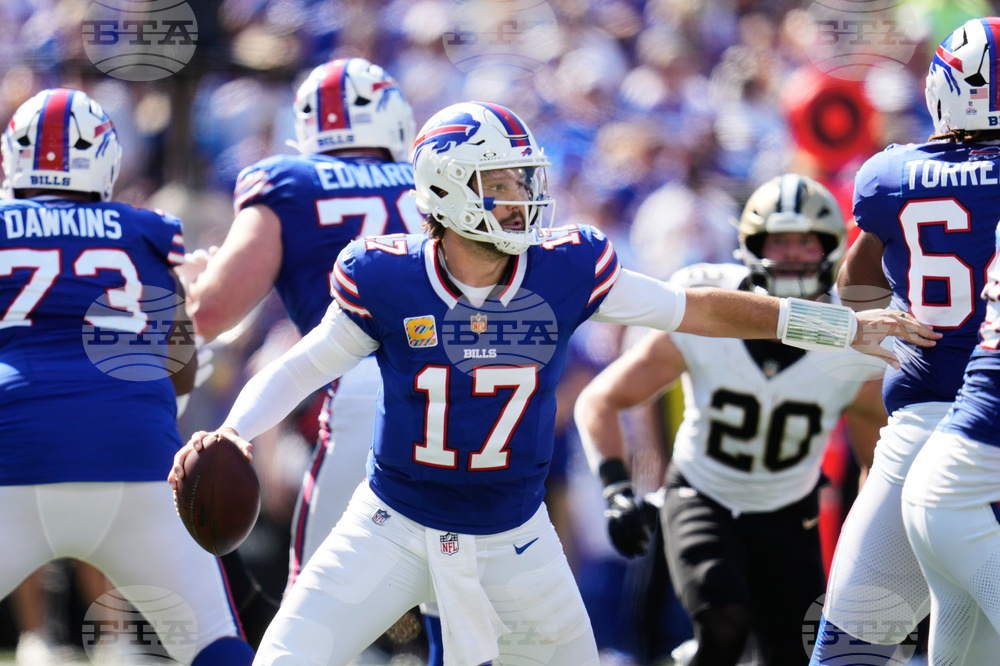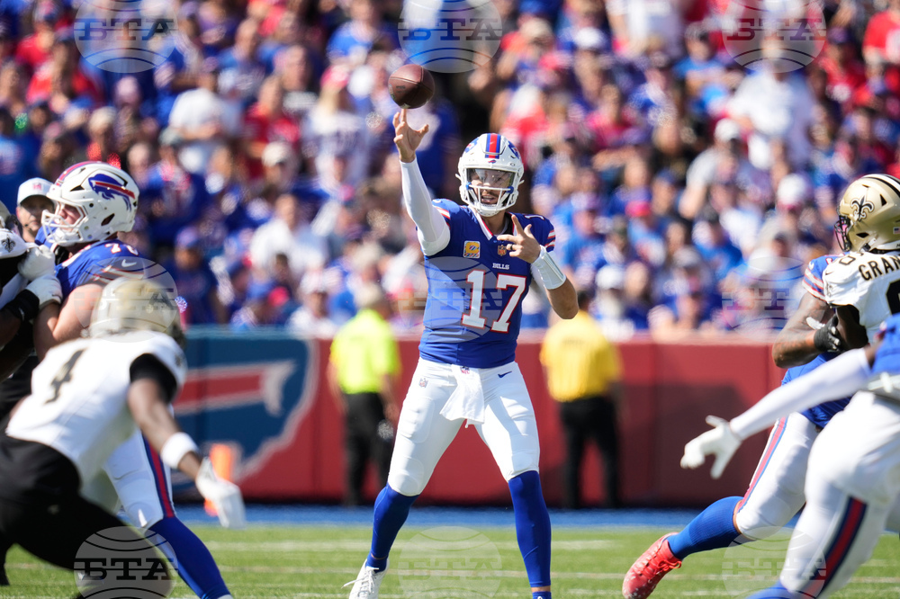 Buffalo Bills quarterback Josh Allen (17) passes against the New Orleans Saints in the first half of an NFL football game, Sunday, Sept. 28, 2025, in Orchard Park, N.Y. (AP Photo/Sue Ogrocki)
