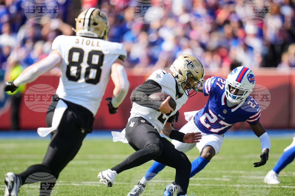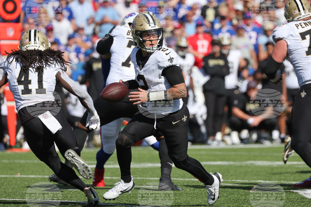 New Orleans Saints quarterback Spencer Rattler (2) scrambles against the Buffalo Bills in the first half of an NFL football game, Sunday, Sept. 28, 2025, in Orchard Park, N.Y. (AP Photo/Sue Ogrocki)